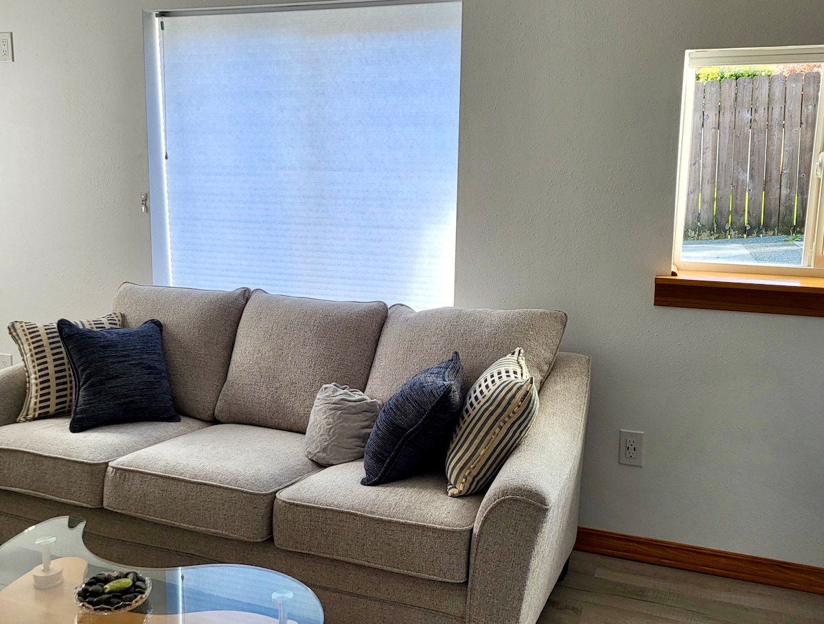 This unit is brand new with a large bedroom with a king bed and a smaller bedroom with a daybed that can be made up for guests (based on reserved guests - can be made into a king as well). Brand new bath with beautiful tiled shower with body jets. Kitchen is ready for some nice homemade meals, table seating for 4. Cozy long couch for nights at home and a cute breakfast nook with bar seating if you need to get some work done.