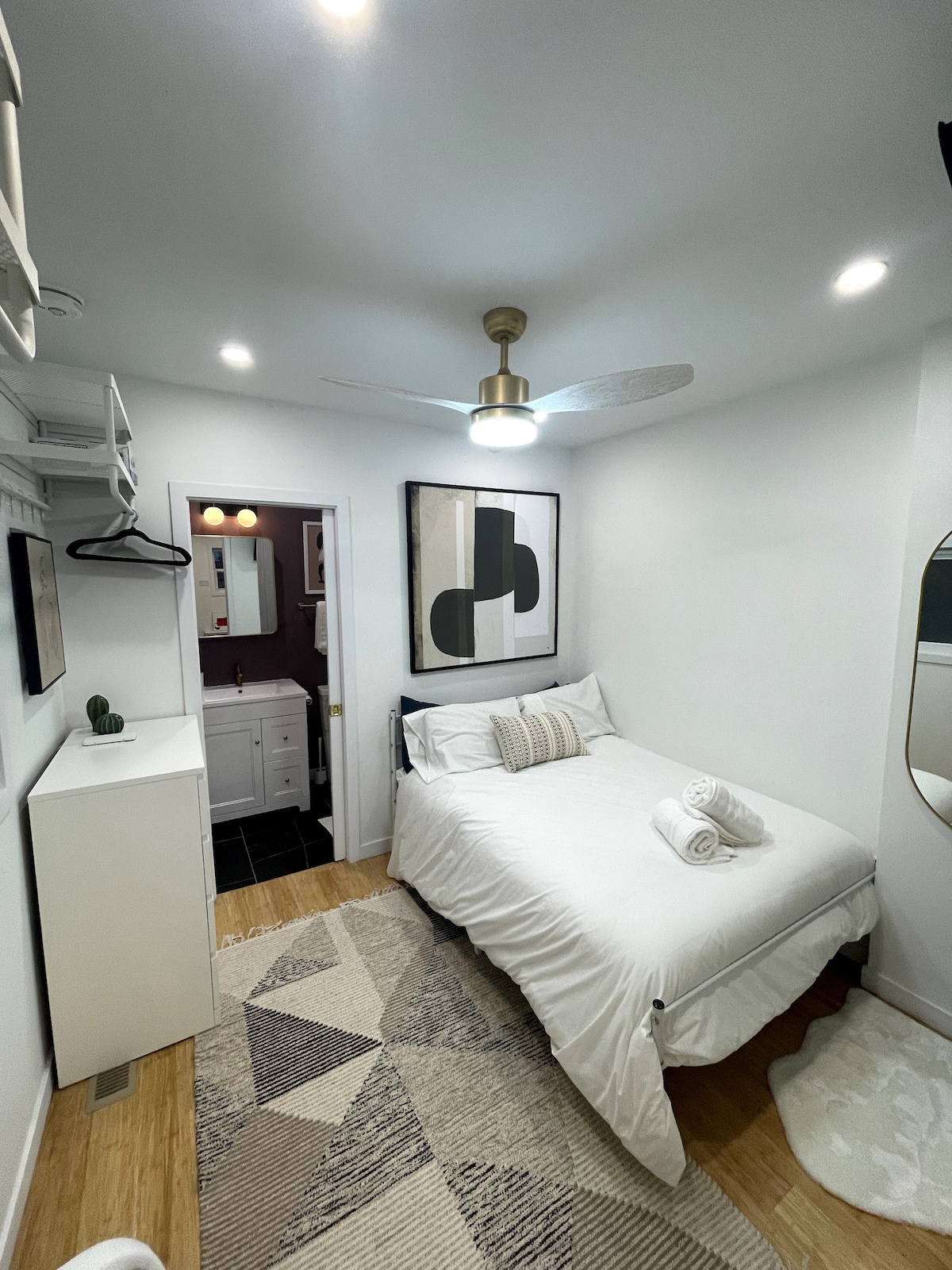 - Bedroom with queen size bed with Casper mattress and wardrobe with hangers.