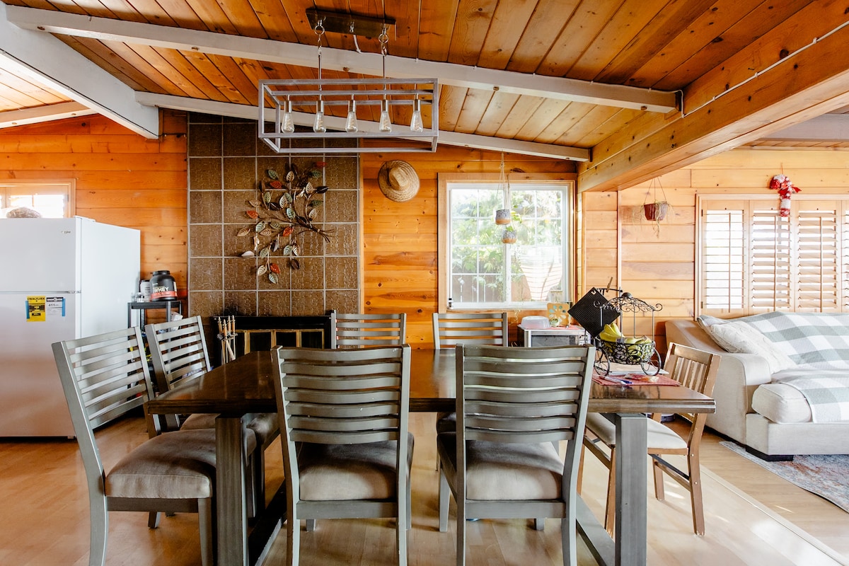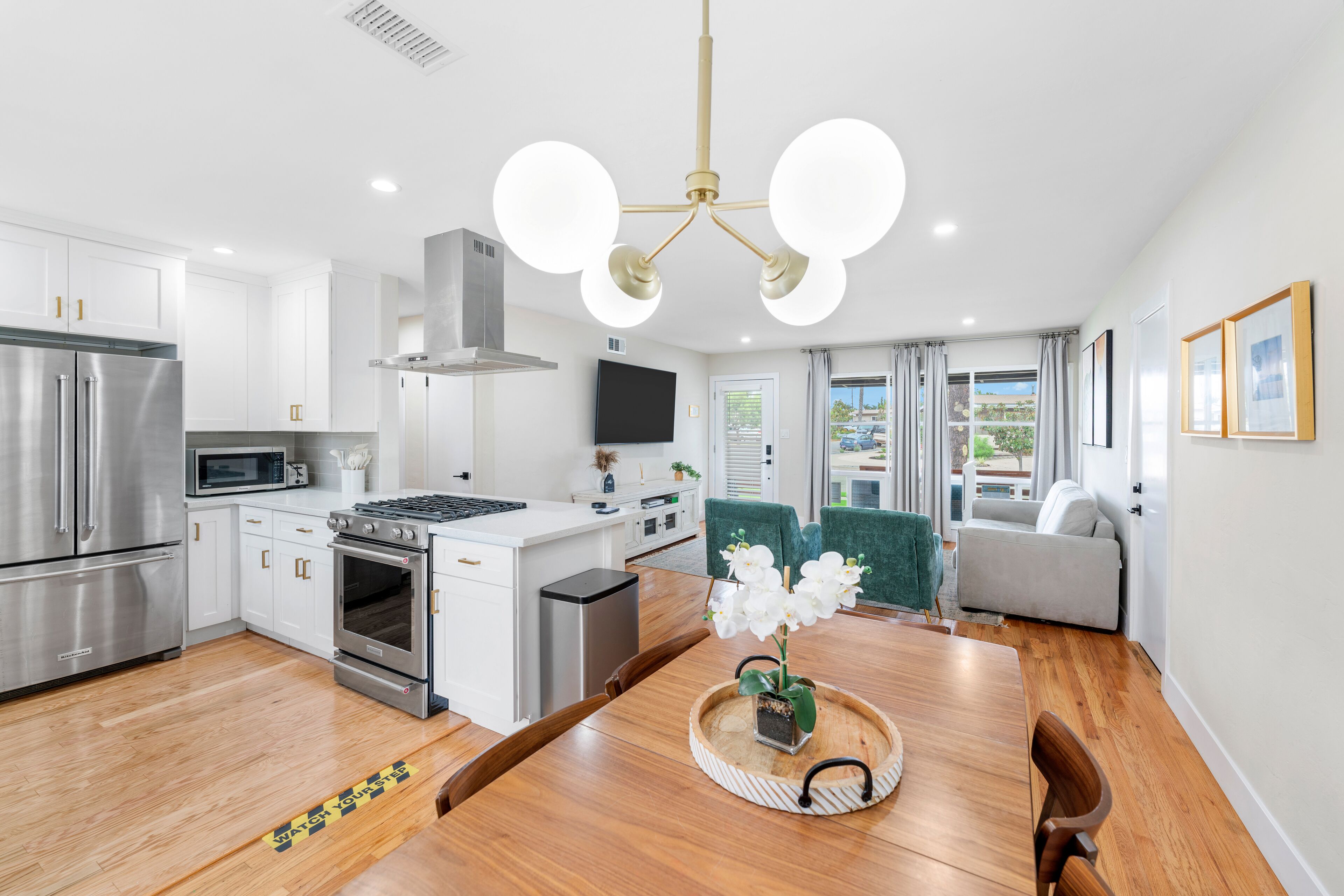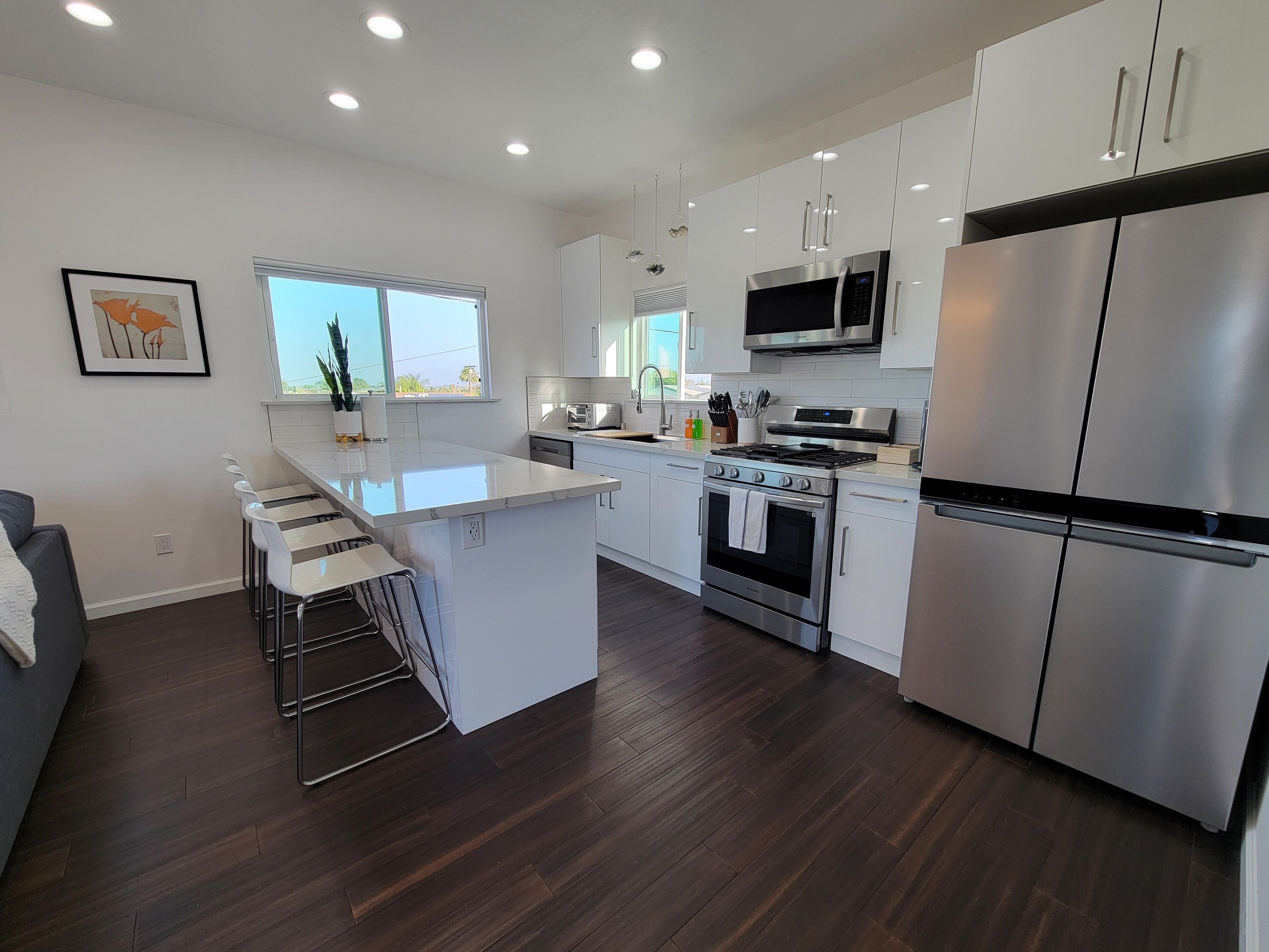 Upon entry you are welcomed into a very open living space with a full kitchen, living room with a wall mounted flat screen Smart TV, full sized couch, and spacious dining nook with seating for 4. There is also a kitchen bar with seating for 3 along the counter. This home is ideal for enjoying a sunny day, as the open floor plan leads out to the large outdoor fenced in private backyard.