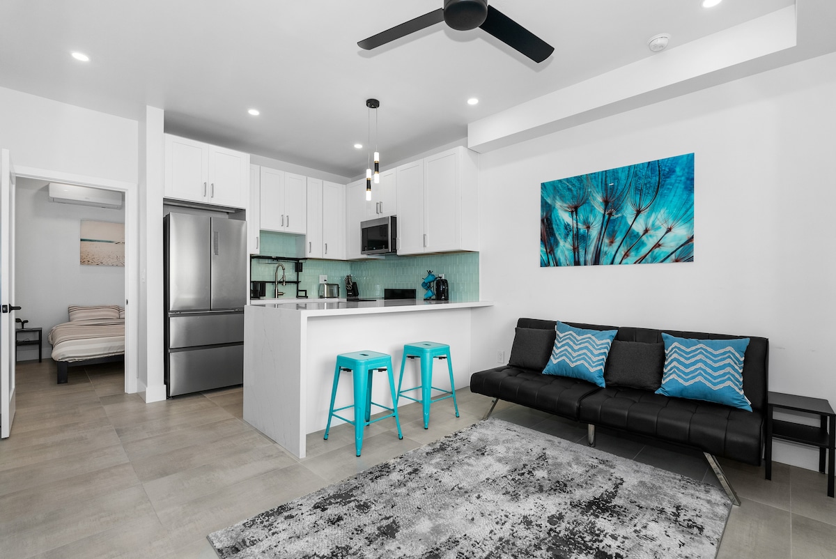 Relax in the modern living space with a fully equipped kitchen, high-speed Wi-Fi, and smart TV. The bedroom features a cozy queen bed.