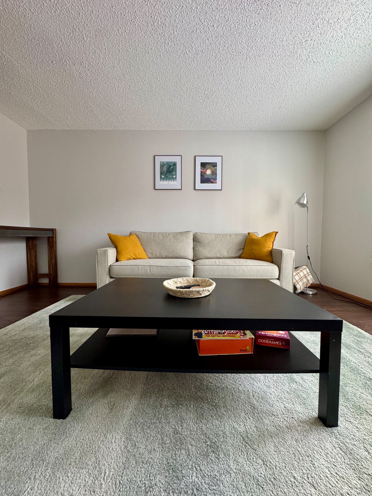 Main Level: A full kitchen awaits your culinary adventures. The living room has vinyl floors and a comfortable Room & Board sofa, creating a cozy space to relax and unwind.