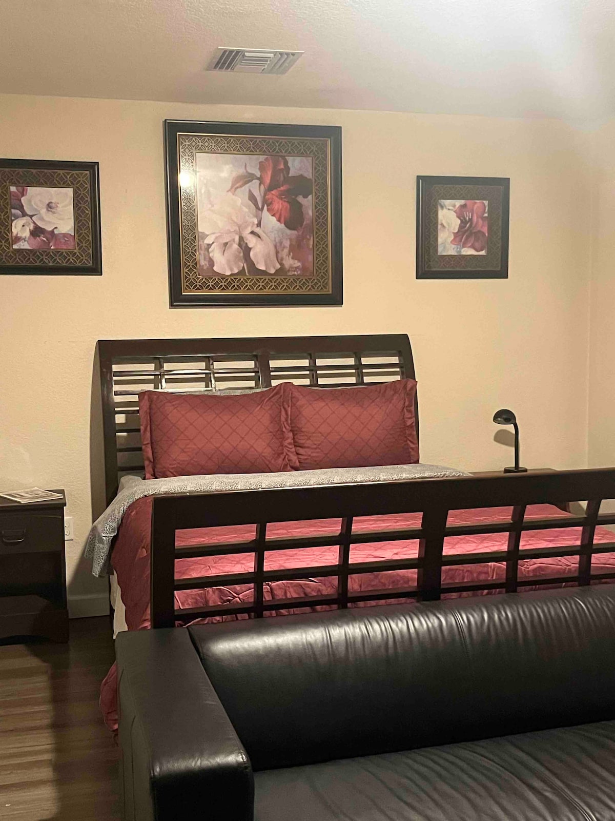 No private entrance. Shared space with private room. 3 bedroom house with two living mates and a service animal. My dog is 100+ pounds and is friendly but looks scary to people who are afraid of dogs, so please do not book or request if you have an issue with dogs in general or big dogs. He is trained and is a service animal. When I’m not home he is locked up or with me. The third room is for you and your guests and you share one bathroom with one of the roommates. If you have an extra guest or two I don’t mind if they crash on the living room couches and extra queen sized air mattress. There is a full sized bed that is very comfortable and the room has access to smart tv. The kitchen is shared and you and guests are to clean up after yourselves when eating or using dishes. The backyard is very spacious and there is a table to sit and eat and a fire pit that is available as well. WiFi is available and washer and dryer is available. I will be giving you access to property as I am always around area or on property.