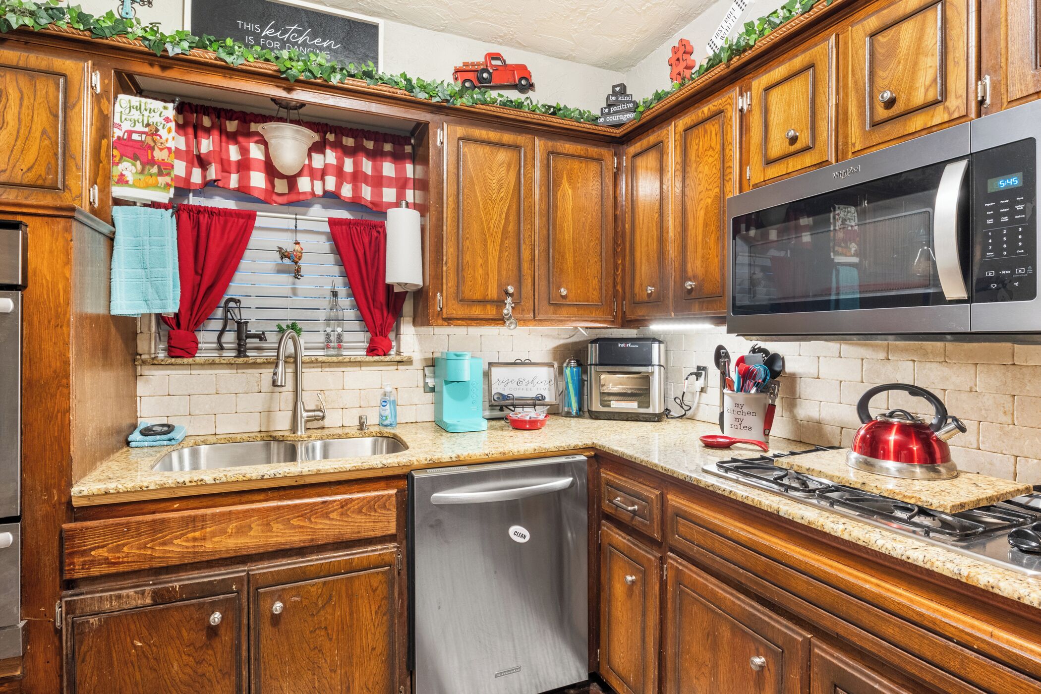 The large country kitchen has plenty of counter space, a double oven, 5 burner cooktop, coffee bar, dishwasher, & refrigerator with filtered water and ice maker. It also has 2 microwaves, & toaster oven. It is stocked with dishes, silverware, pots & pans, baking pans, cookie sheets, & the utensils for baking & cooking. It also has 1 crockpot, a rice maker, a blender and small food processor,