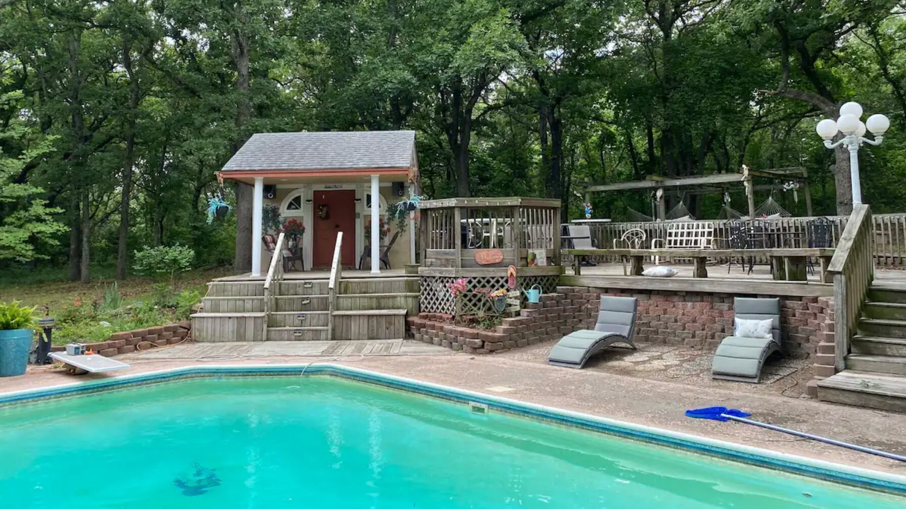 Relax with the whole family at this peaceful getaway . This 3 bedroom 2 bathroom home sleeps 6 and is located on 20 secluded acres with private wooded hiking trails and a 3 acre spring fed stocked pond! Enjoy exploring our one of a kind property and seeing all the wildlife! We have a row boat available so bring your poles! Our game shop has ping pong, basketball and other games. Located 45 minutes from OKC and 10 minutes from OKlahoma Baptist University! REST ADVENTURE PLAY EXPLORE UNPLUG