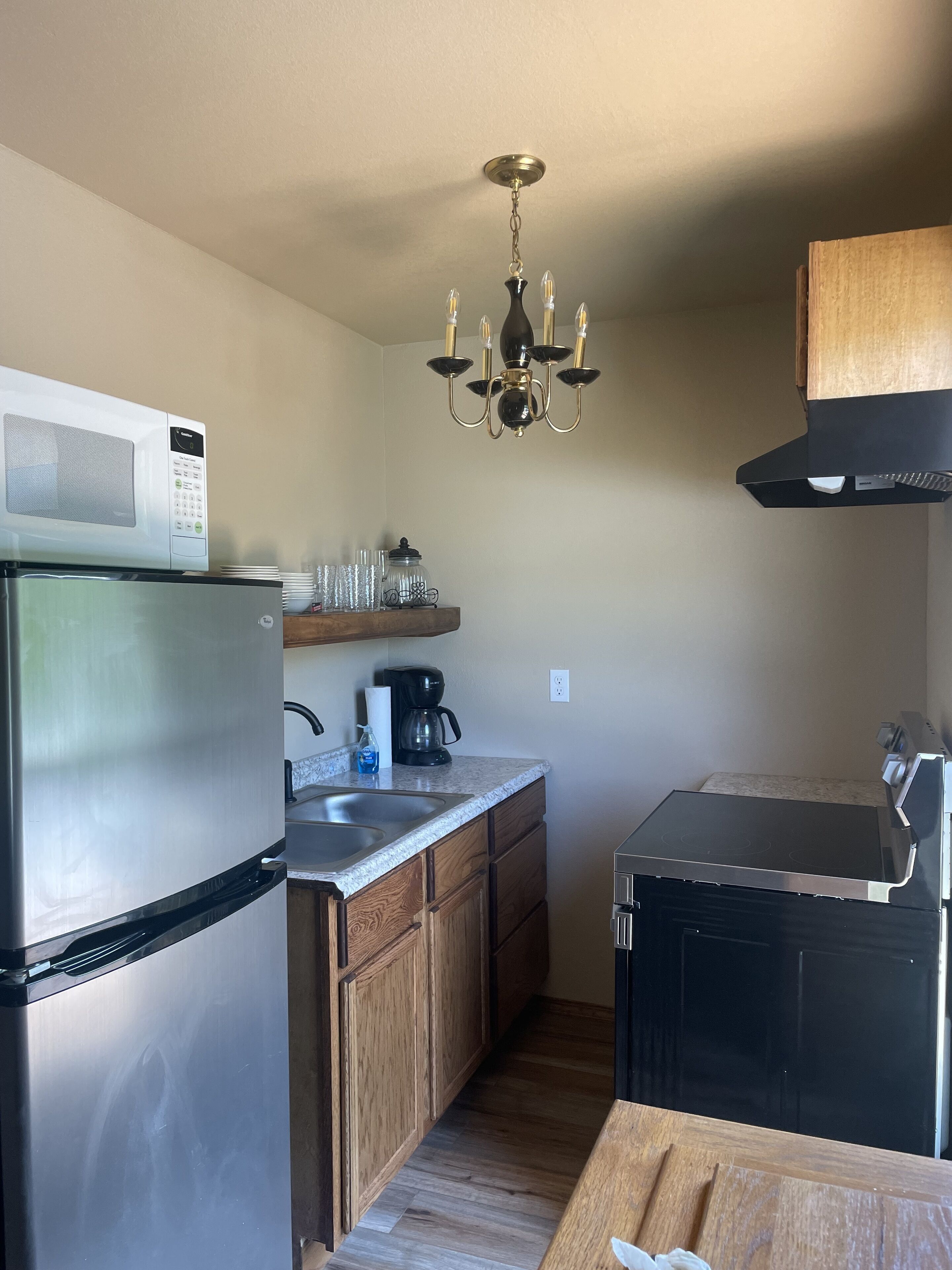 Make use of the kitchen that is stocked with decaf and regular coffee, Hot Chocolate mix, flour, sugar, sweeteners, powdered creamer, salt, pepper, garlic salt, Seasoned salt, chili powder, garlic powder & basil.
