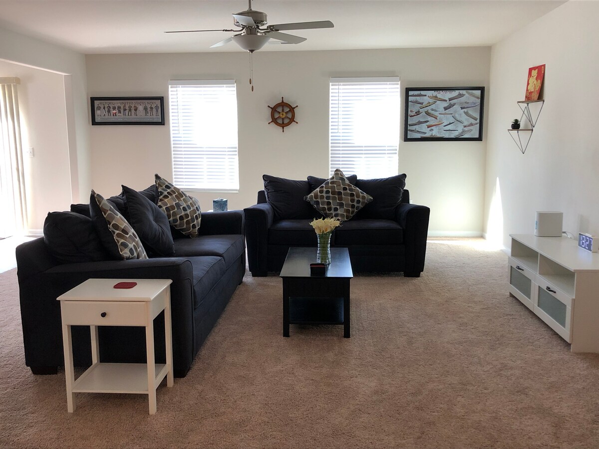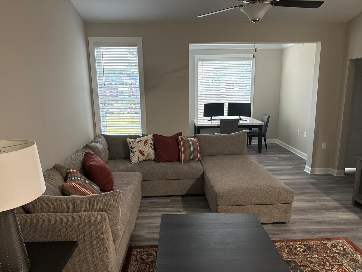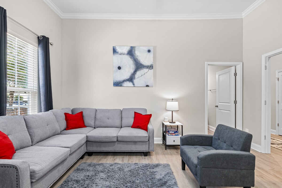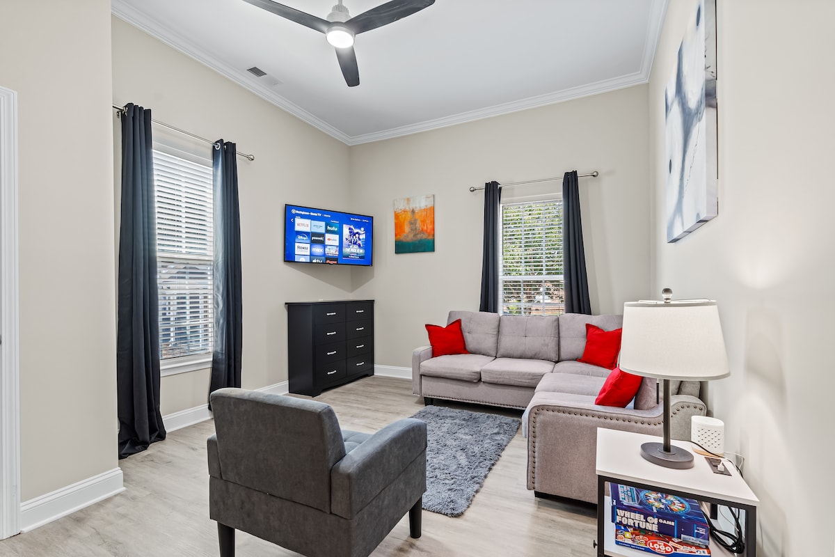 The open living space includes two TVs with Netflix, Hulu, and other streaming apps, a well-equipped kitchen, and a dining area perfect for meals or game nights.