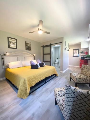 On the property is a charming farmhouse with two bedrooms and one full bath and one half bath specifically set up for accommodating and entertaining large groups (owners have 5 kids, who all bring their friends for overnight sleep-overs!) With a queen-sized bed in the master bedroom, two sets of bunk beds in the other bedroom, as well as a queen-sized air mattress available the great room - which all mean you can sleep up to 6 comfortably, or up to 8 if you have a big family like we do! Includes newly renovated modern kitchen and bathroom, washer/dryer, new water heater, A/C, etc. Media includes HDTV with DVD player, free WiFi, and a bunch of popular movies for your use. We even have a closet full of books, puzzles and board games if the kids ever wear out from all the fun in the sun.