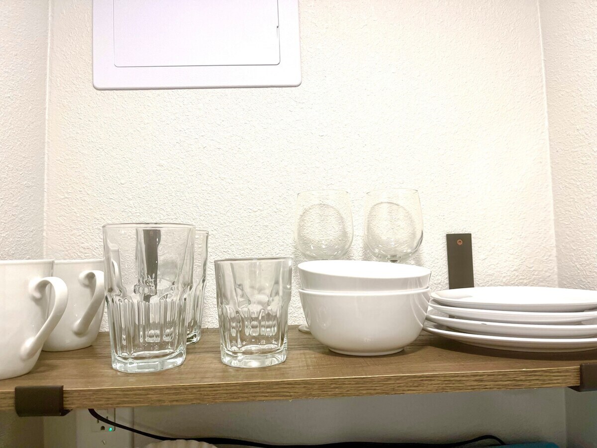 Since this is a studio, the kitchen is open to the sleeping/living area. The bathroom and small closet are located in the back of the space and are closed off by a pocket door. It's a small space, but we think it's perfect for one or two people. Curl up on the bed with a book or stream your favorite show on the Smart TV as the evening quiet settles in.