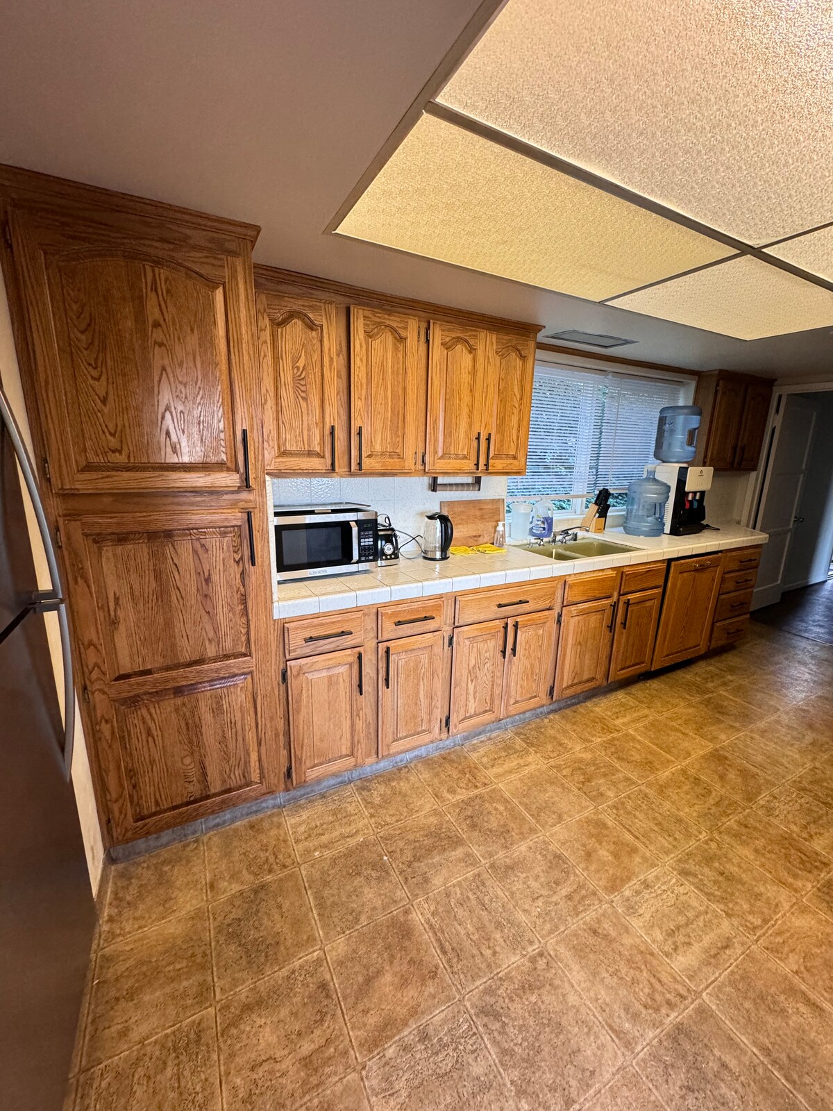 Kitchen appliances are: a stove, microwave, gas oven, coffee maker, electric kettle, and refrigerator with freezer.