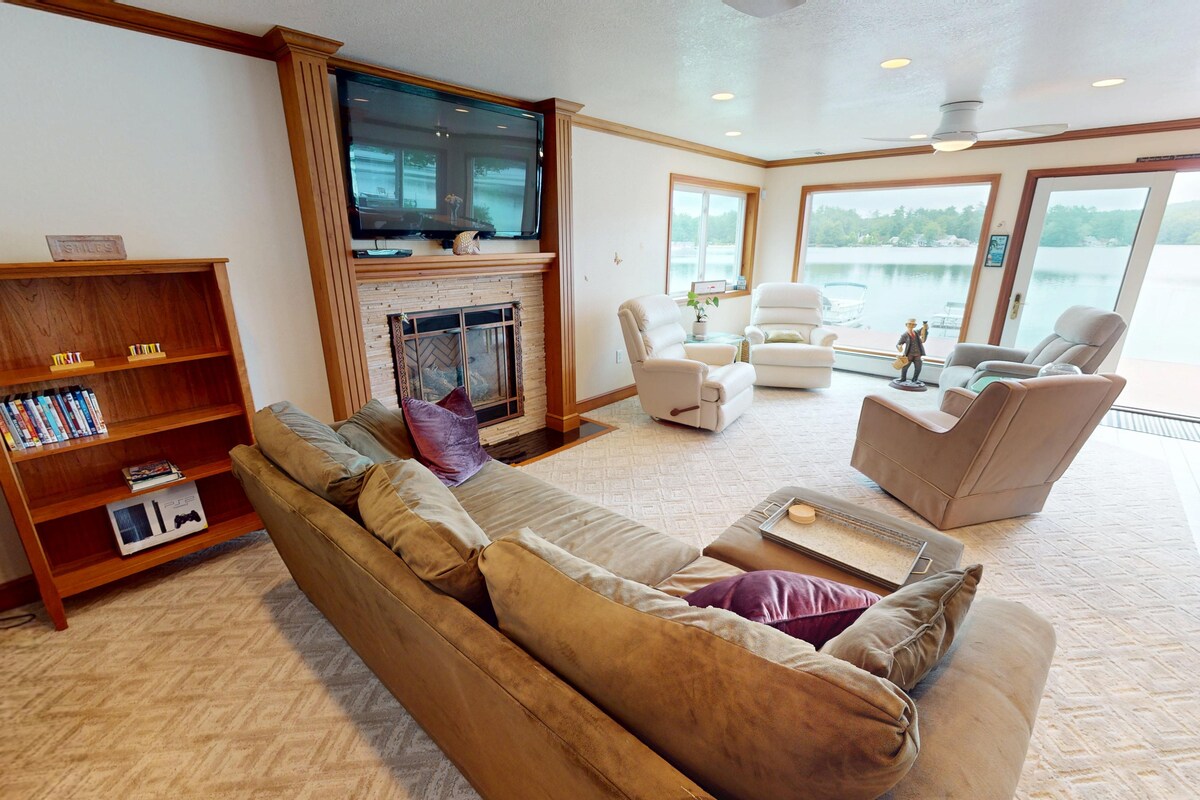 Living (1st floor) - Couch and 4 armchairs (incl. reclining, swivel, rocking) overlook the lake. Gas fireplace & ceiling fans keep you comfortable year round. Well stocked with books, games, dvds and a PS2. Wall-mounted flat screen smart TV to access your favorite streaming subscriptions.
