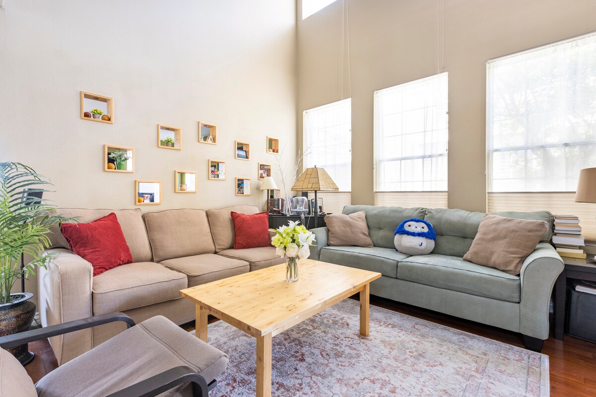 3 bedrooms, 2 full baths. Sleeps 8. Cozy setup, spacious living area & high-vaulted ceilings + smart flatscreen TVs in all rooms!