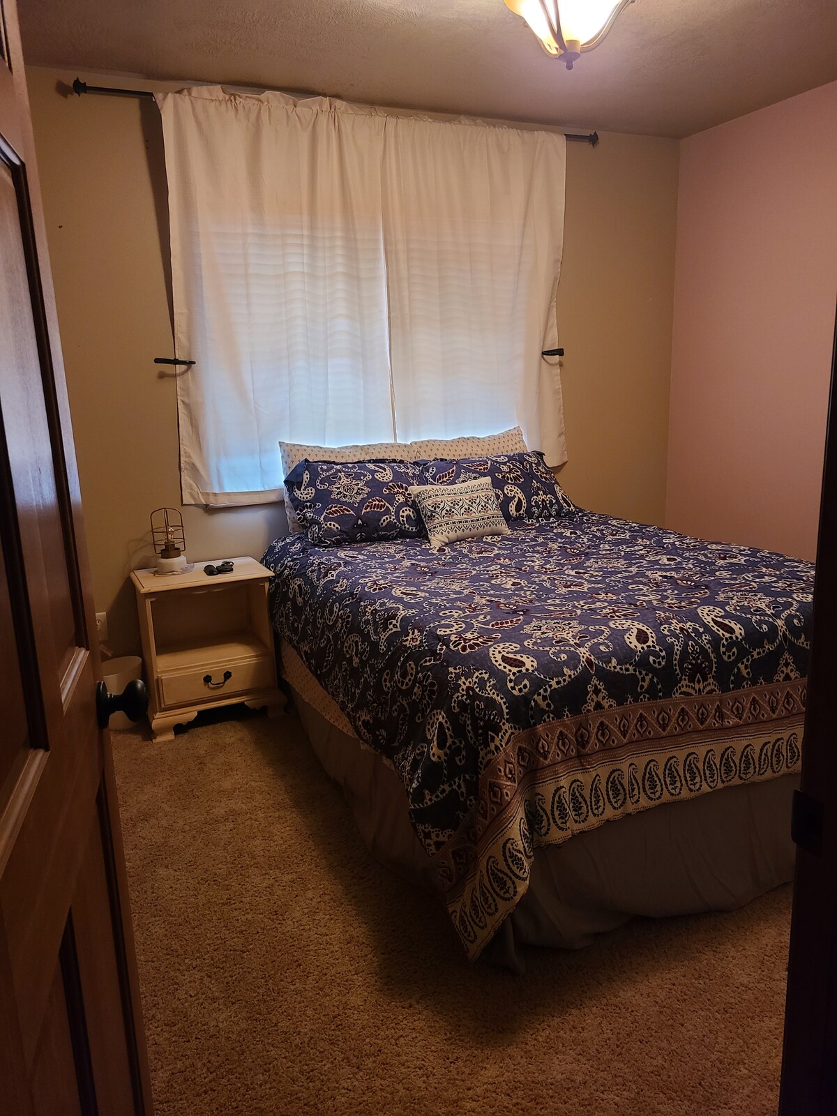 Private bedroom with a comfortable queen bed with living room and bathroom in the downstairs living area. Both may be shared if another guest is renting the second basement bedroom. Pets are negotiable with an added fee.