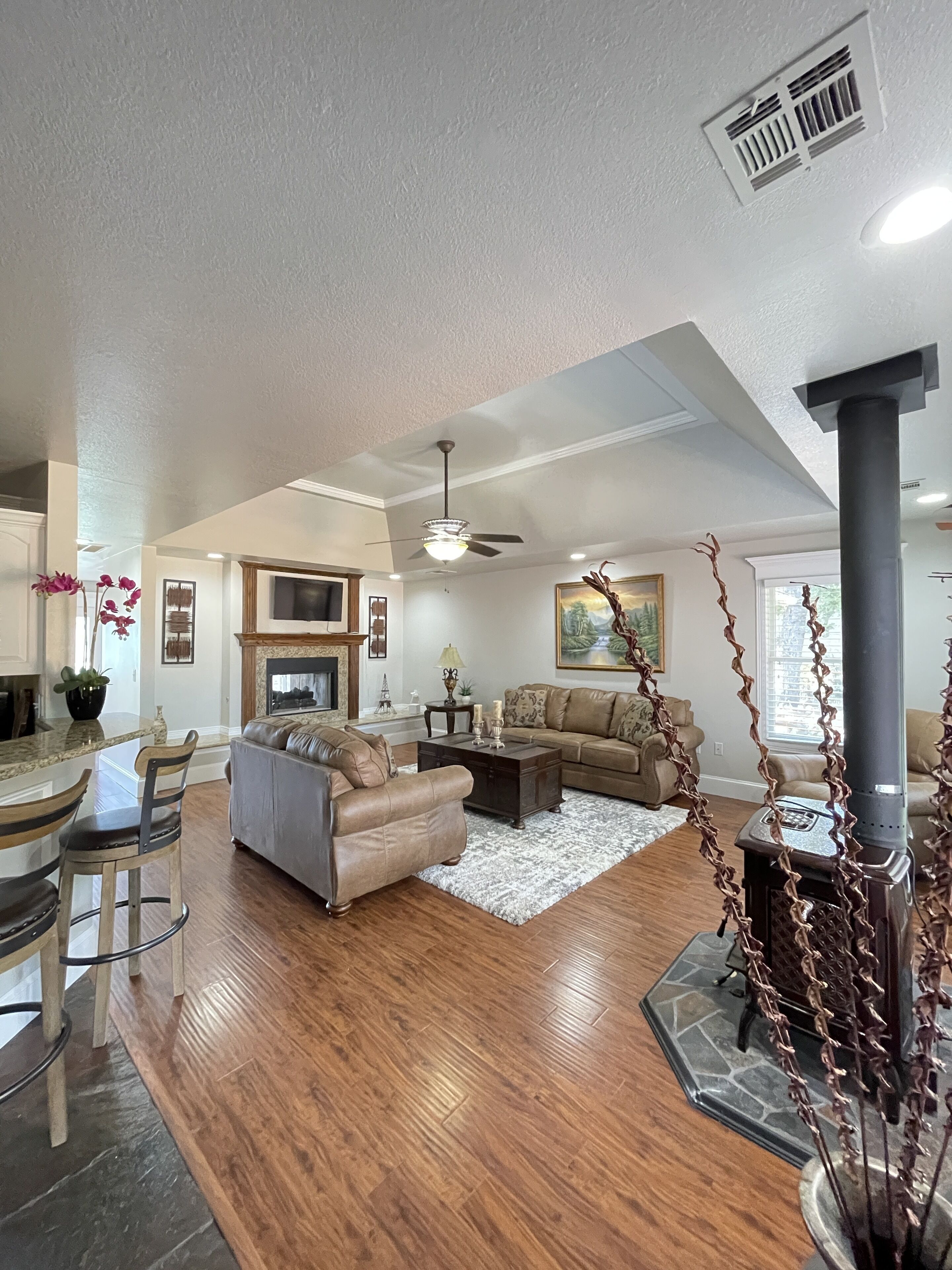 2 A/Cs, Fireplace, Tankless Hot Water On Demand, 2 TVs, 2 couches, Reclining Love Seats, Vintage Decor, Outdoor Speakers, Propane Grill, Washer/Dryer, King size Bed, Microwave, Gas Oven, Ceiling Fan, Deck ETC.
