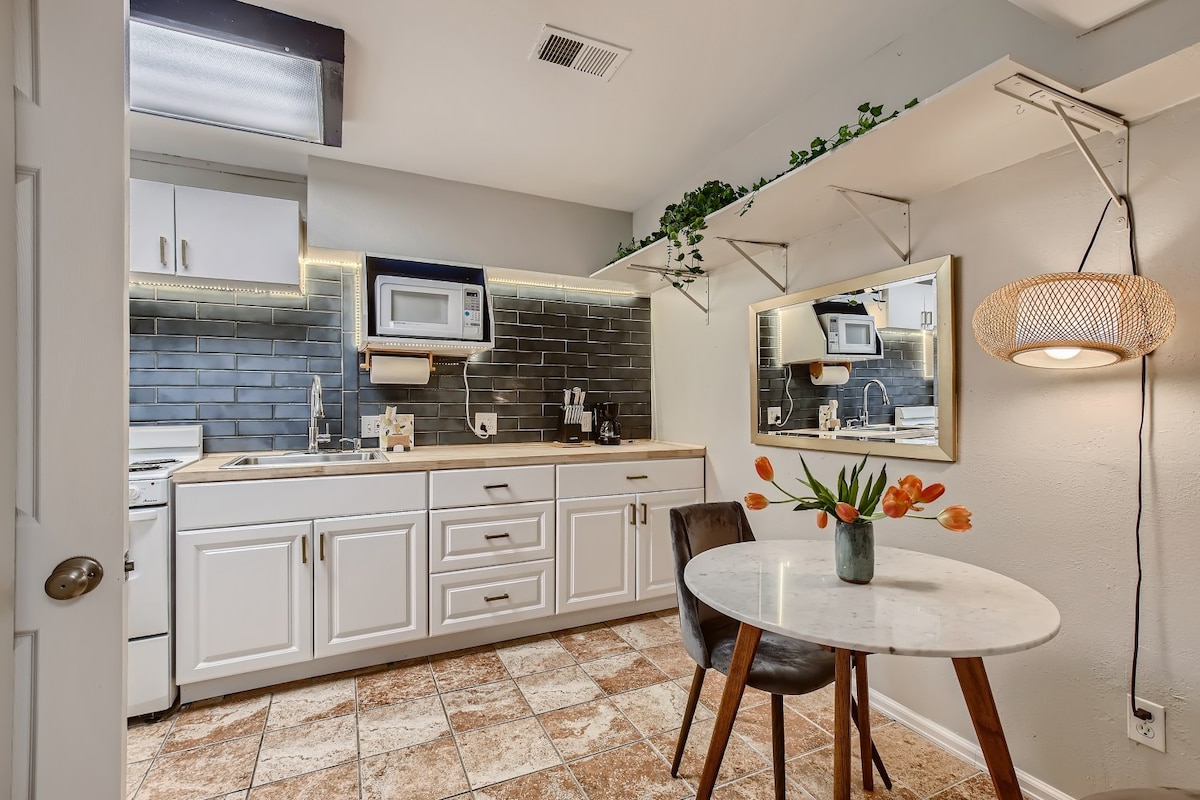 The full kitchen includes large beautiful sink, refrigerator/freezer combo, dish washer, keurig coffee machine, air fryer, toaster oven, and anything you would need for an extended stay. You will feel right at home with the ample counter space and cute kitchen decor.