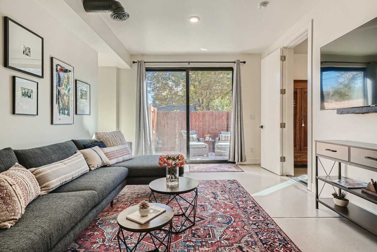The private furnished deck out your front door has total privacy and plenty of Denver sunshine. Four gooseneck lamps, custom built sofa, and a propane modern fire pit make this outdoor space super sexy at night - it’s amazing! The outdoor space also has a small bistro table and Weber gas grill. There is also a small section (8'x8') artificial turf.