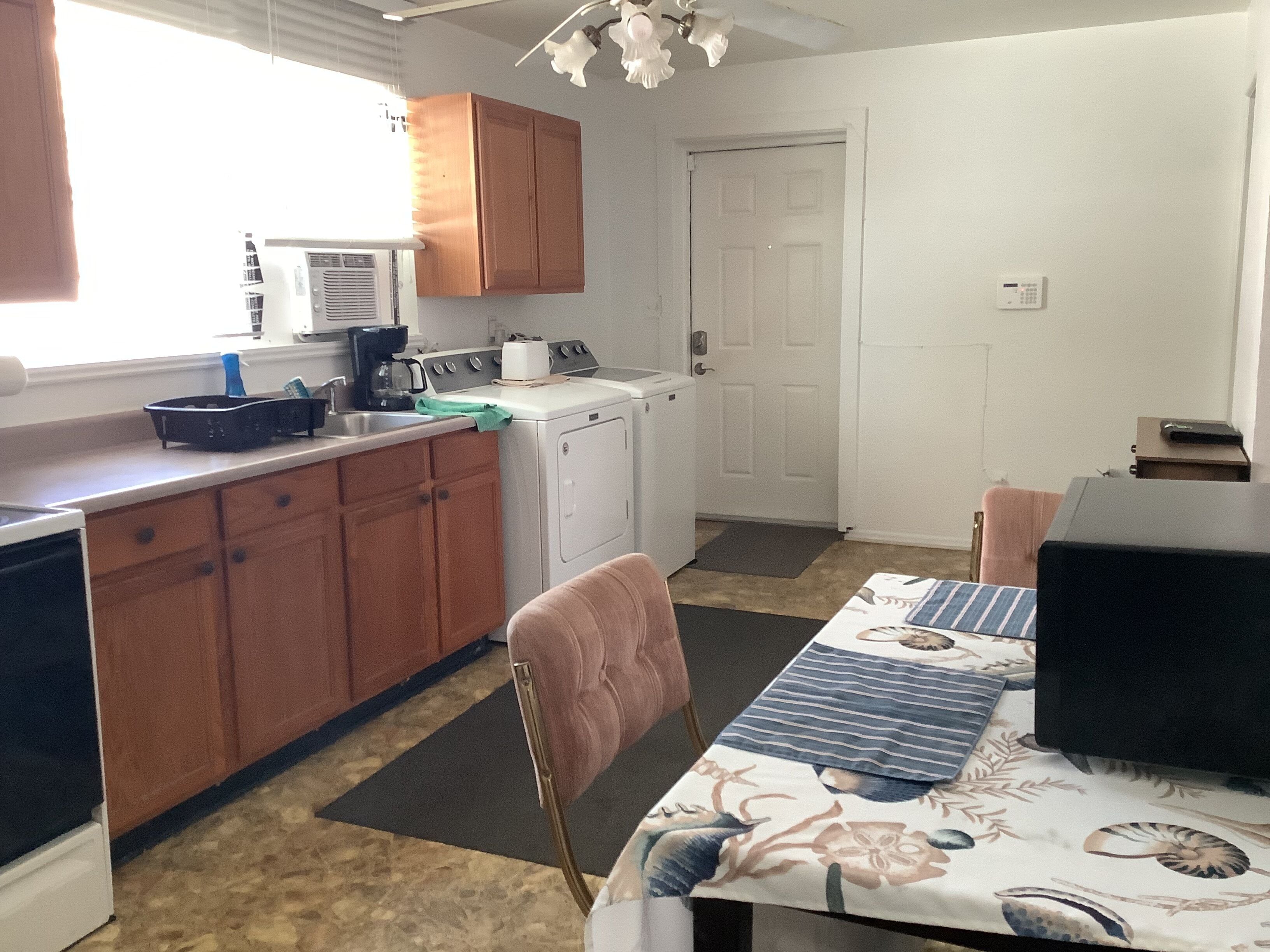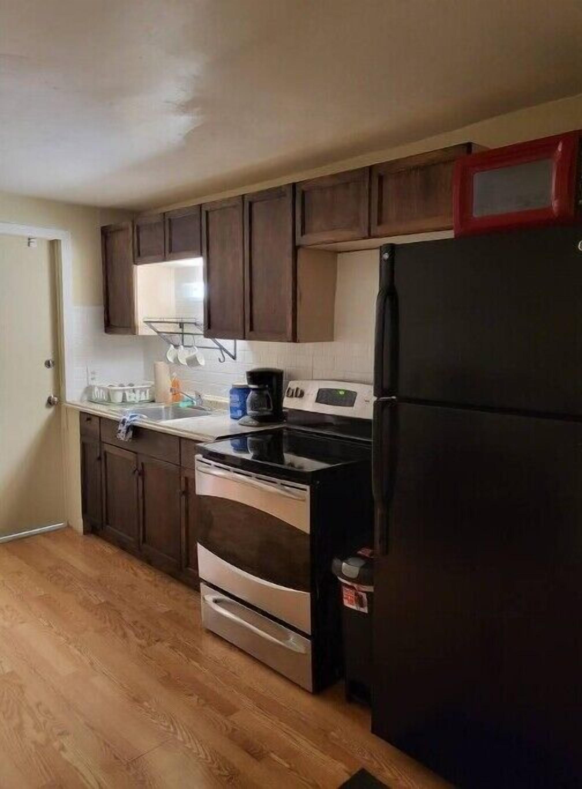 Private FIRST FLOOR 500 sq ft apartment with a fully stocked kitchen. There is a portable 2-burner cooktop, microwave, toaster oven, coffee maker, and all utensils and cookware needed for a great meal! Everything is new at this fully renovated apartment!