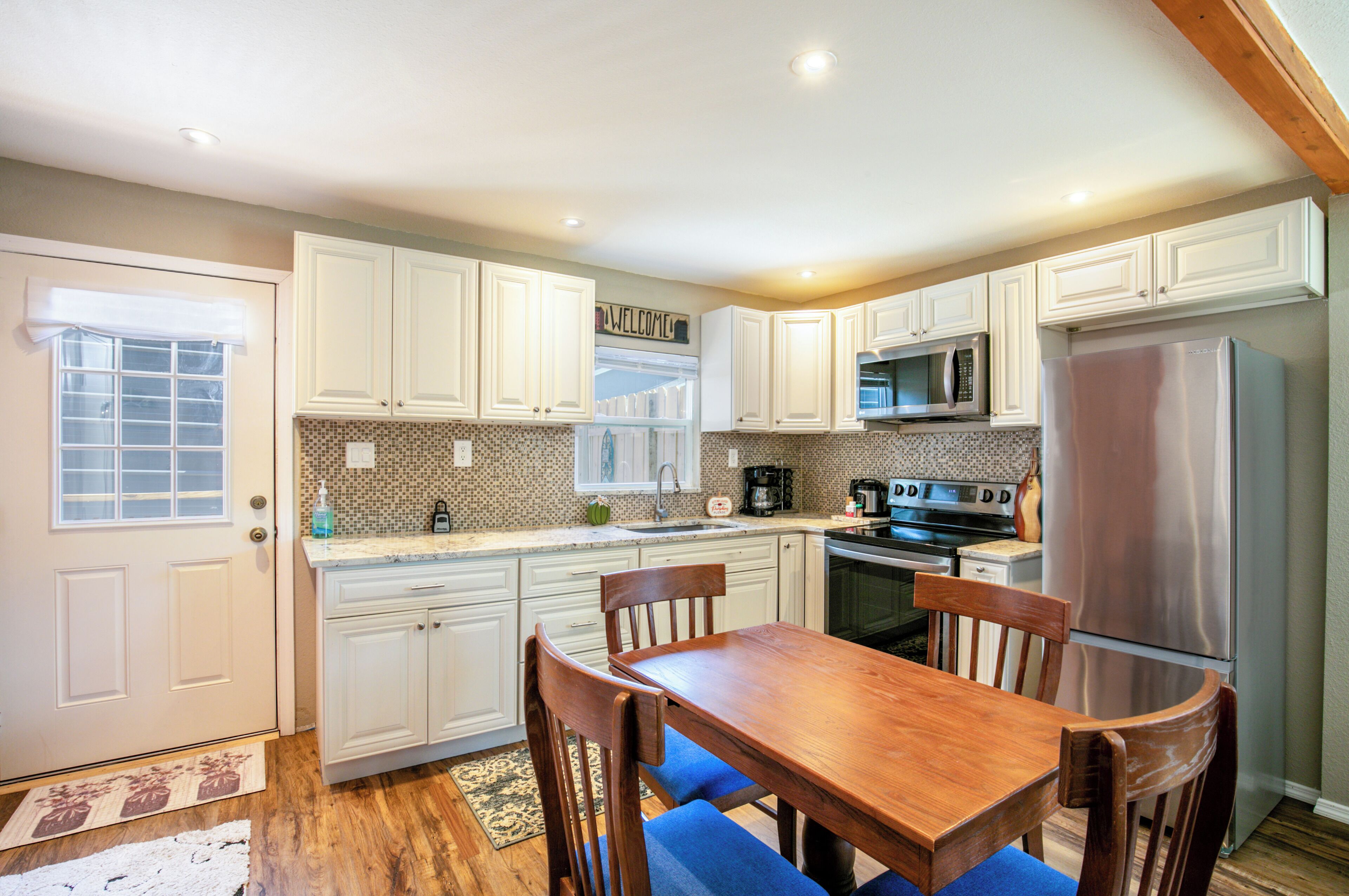 → The kitchen is fully equipped with a coffee maker, toaster, toaster oven, full oven, stove, microwave, blender, air fryer, dishwasher, large refrigerator, and everything you need for cooking your meals. The dining room features a large table for six and a bar for extra seating.