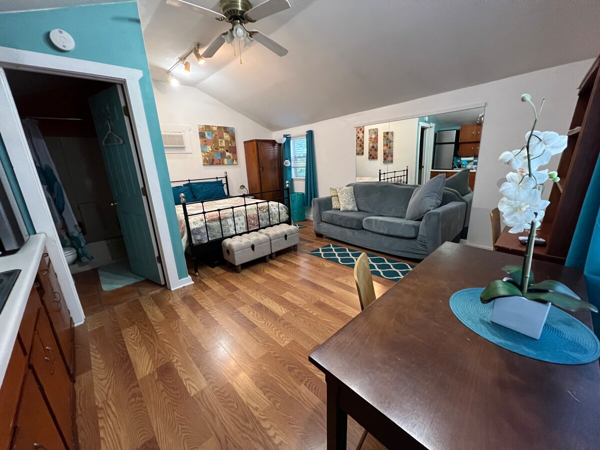 The property has a main house and a back house. The tiny house has its own walkway and parking spot in the driveway. There's lighting along the path. Inside the tiny house there's a queen bed and a sofa that folds out into a bed. The kitchen and bedroom are all one room (like a studio) with one door going to the outside and one going into the bathroom. Its a full bath with tub and shower. A laundry area is in the carport and is shared with your hosts.