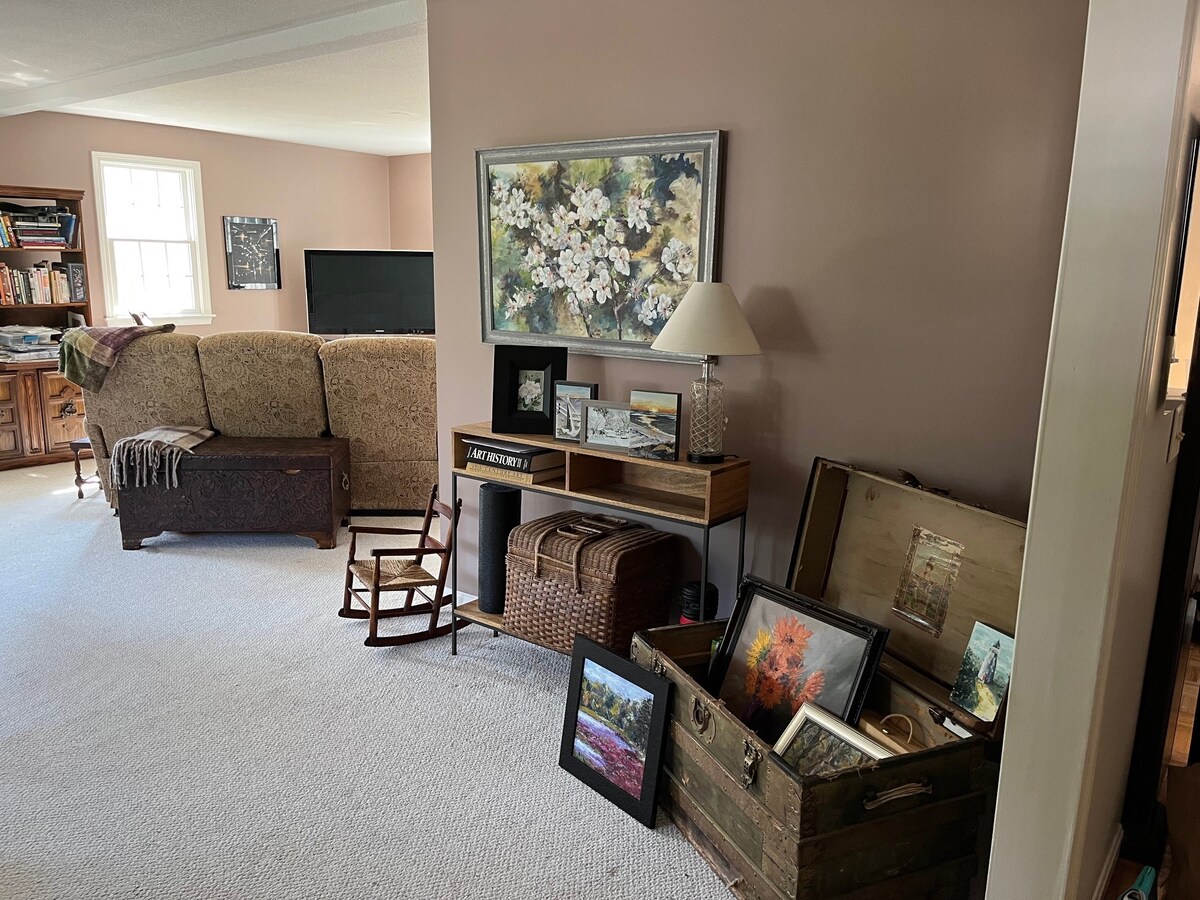 Heading to the basement there is another living space with a TV, leather couch, game cabinet and mini fridge. There is NO bathroom in the basement. We have a desk, chair and a printer in the common space in the basement.