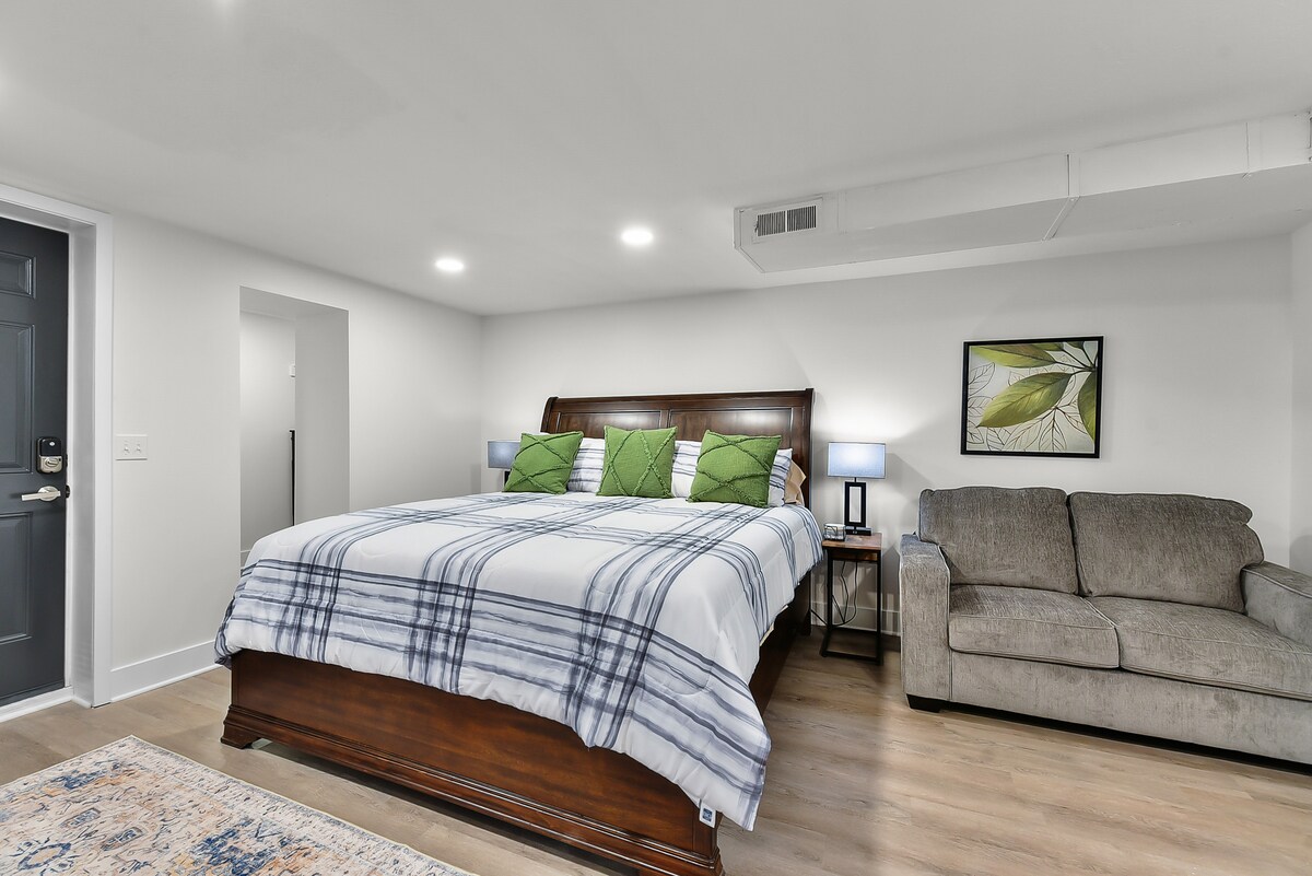Studio with king bed, Smart TV, Free Coffee, WiFi. Lower level below grade.