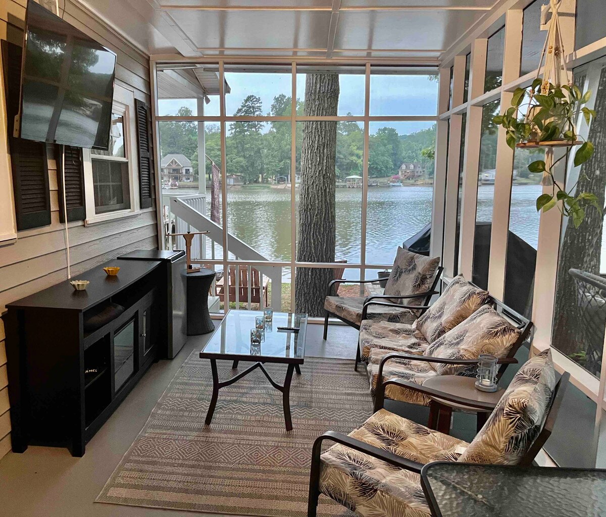 Guests may enjoy their favorite YouTube TV, HULU & ESPN shows & games on the 55" covered screen porch TV overlooking the lake!