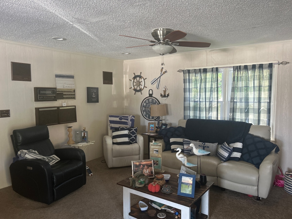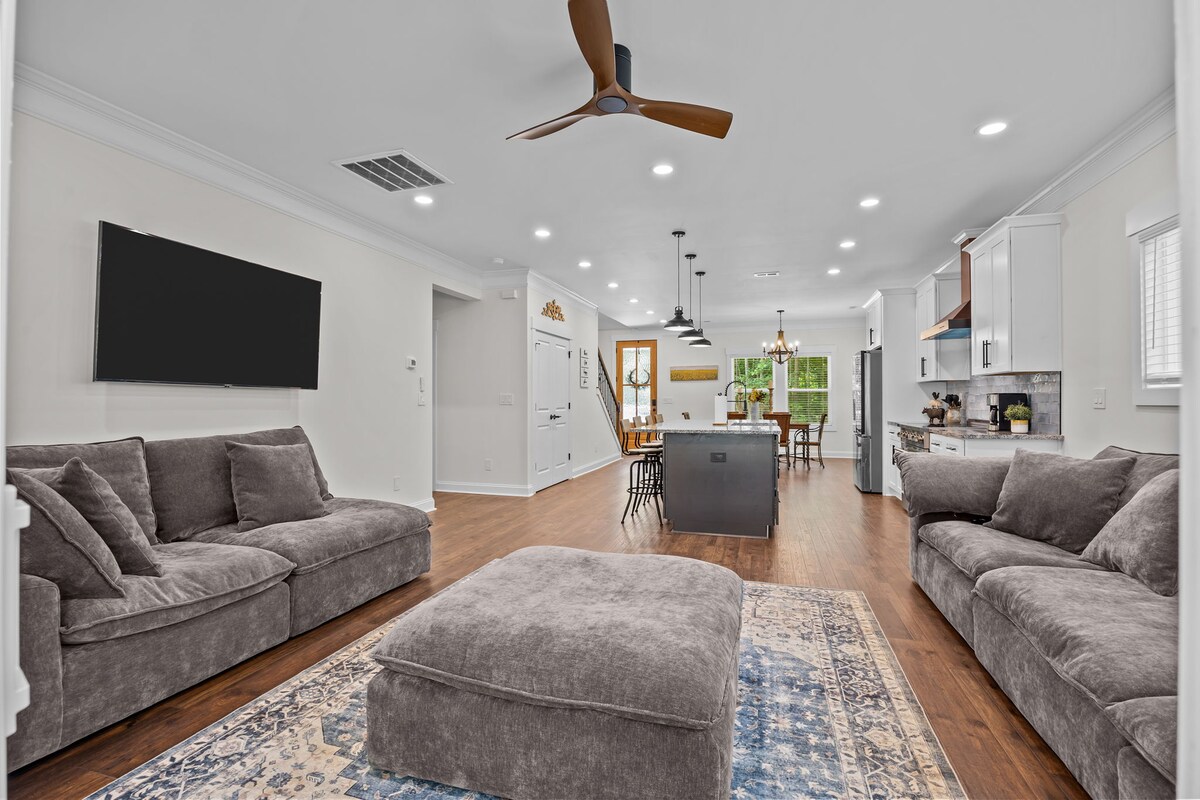 Living Room: features a couch, oversized chair, and electric love seat recliner with console in front of a panel of windows with amazing views of the lake. It is a great place to enjoy views of the outdoors or to lounge in front of the TV. It is open to the kitchen for open concept entertainment.