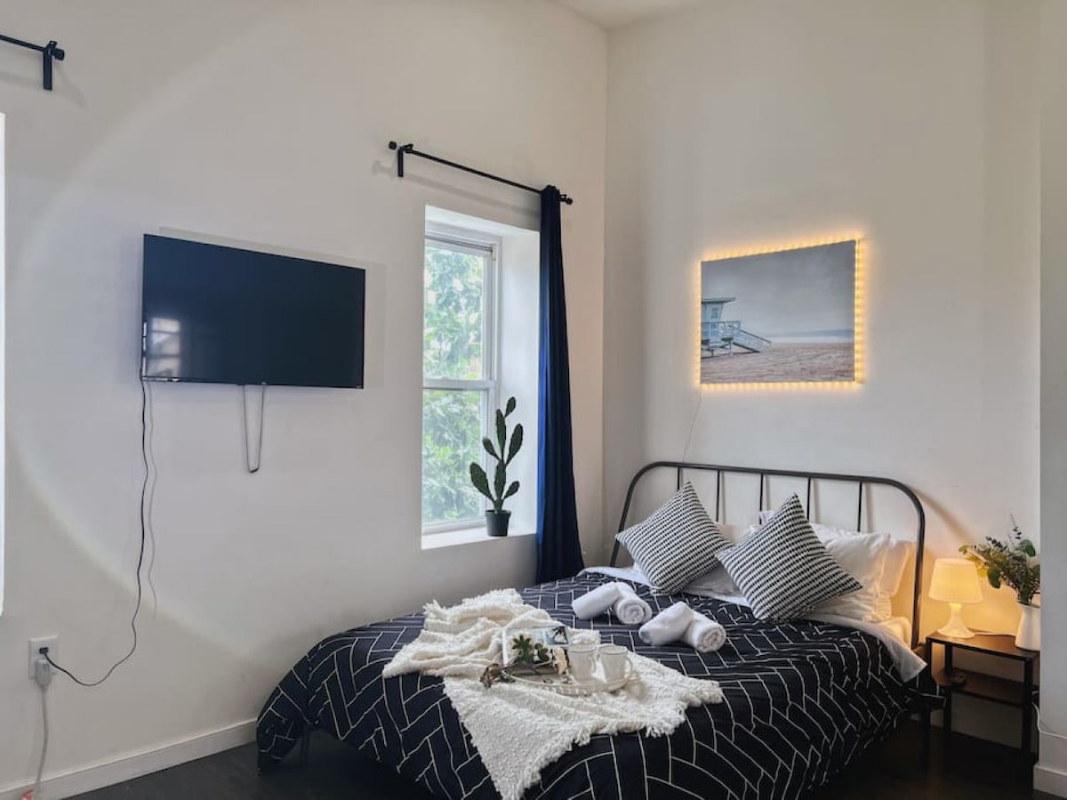 Step into your private sanctuary and be greeted by stylish decor and thoughtful touches that create a warm and inviting atmosphere. The studio features a comfortable queen-sized bed adorned with soft linens, providing a restful night's sleep after a day of exploring the city.