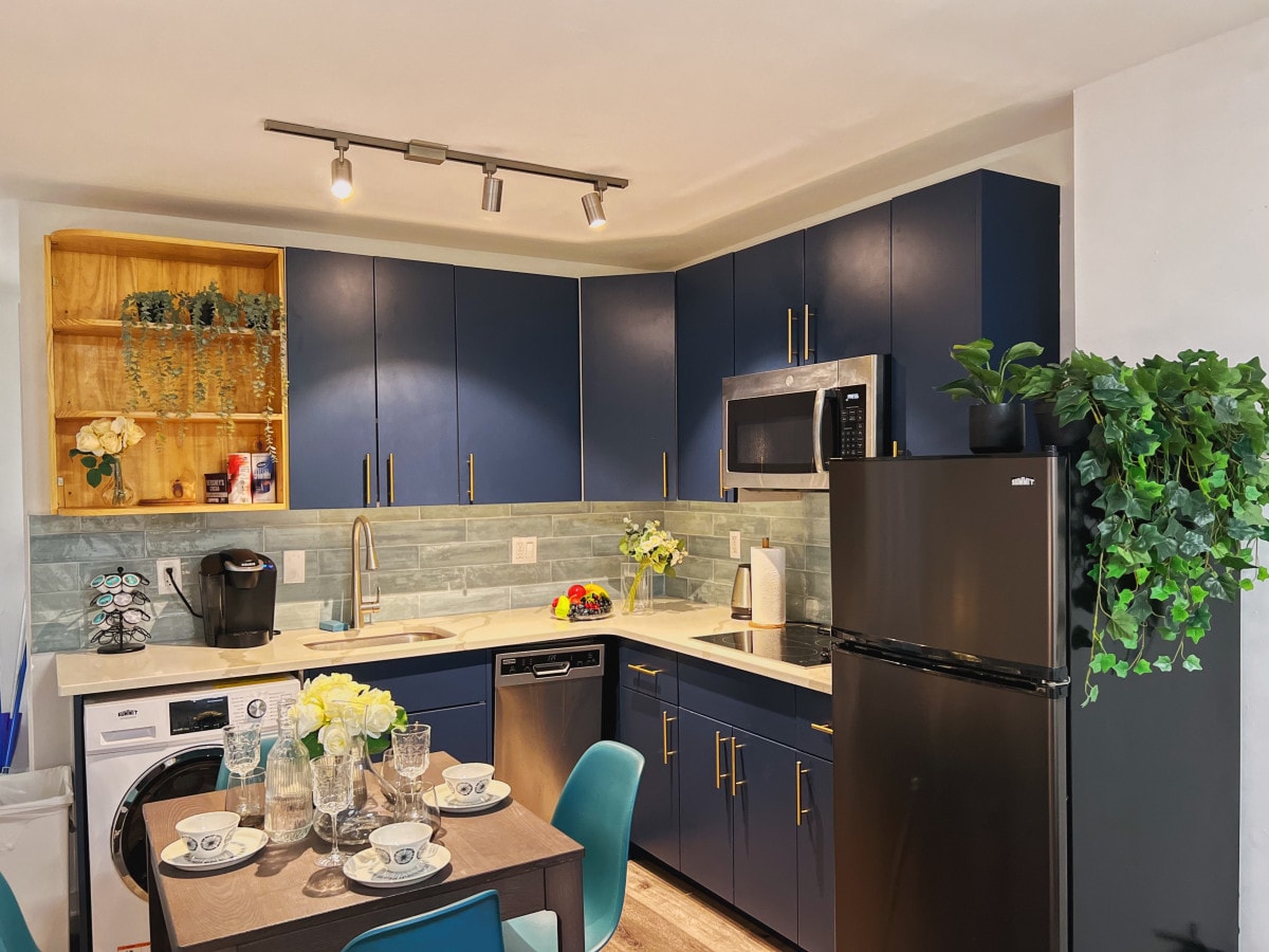 A small countertop dining area, adorned with modern bar stools, offers a delightful space to enjoy your meals. We've provided dining wares so you can relish your dishes in style.
