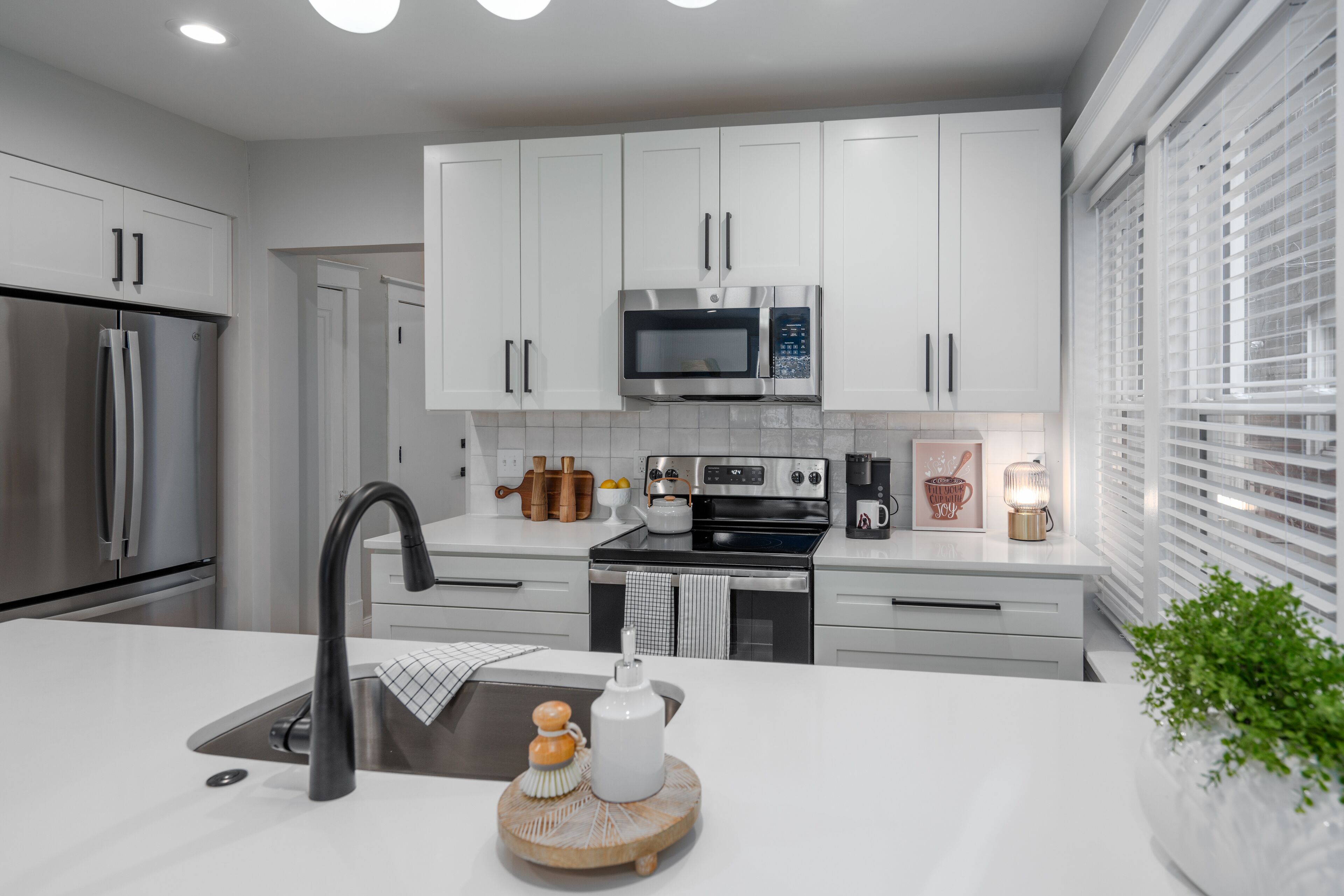 Fully stocked/functional/ spacious kitchen offers ample counter and storage space with a table and seating for 4 and stainless steel appliances.