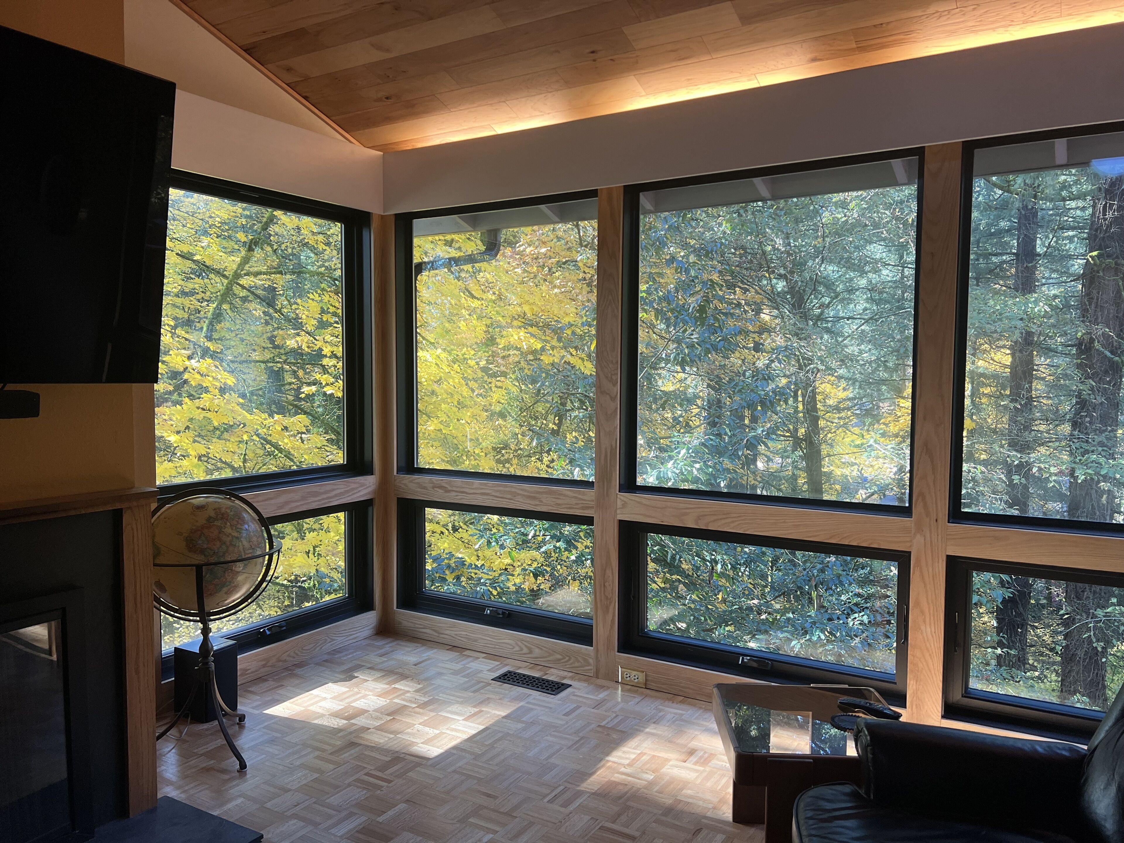 Home is furnished with period furnishings. Living room floor to ceiling windows you just see a dense woodland crowned with 125 foot tall Douglas firs.