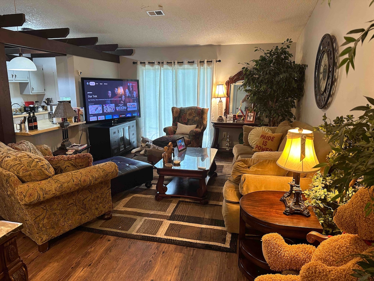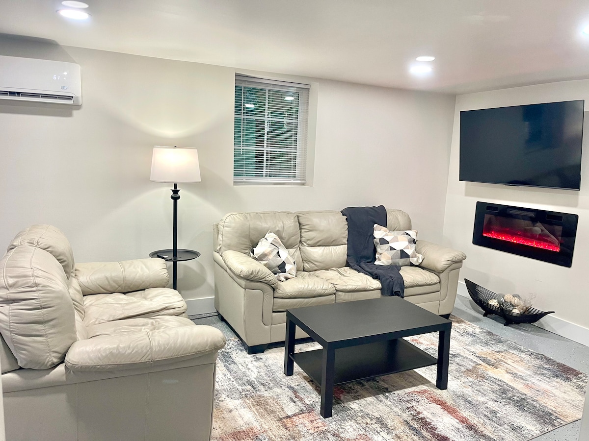 The front door opens to a large living room with a 65” TV and spectrum cable. All 3 bedrooms are equipped with new smart TVs!