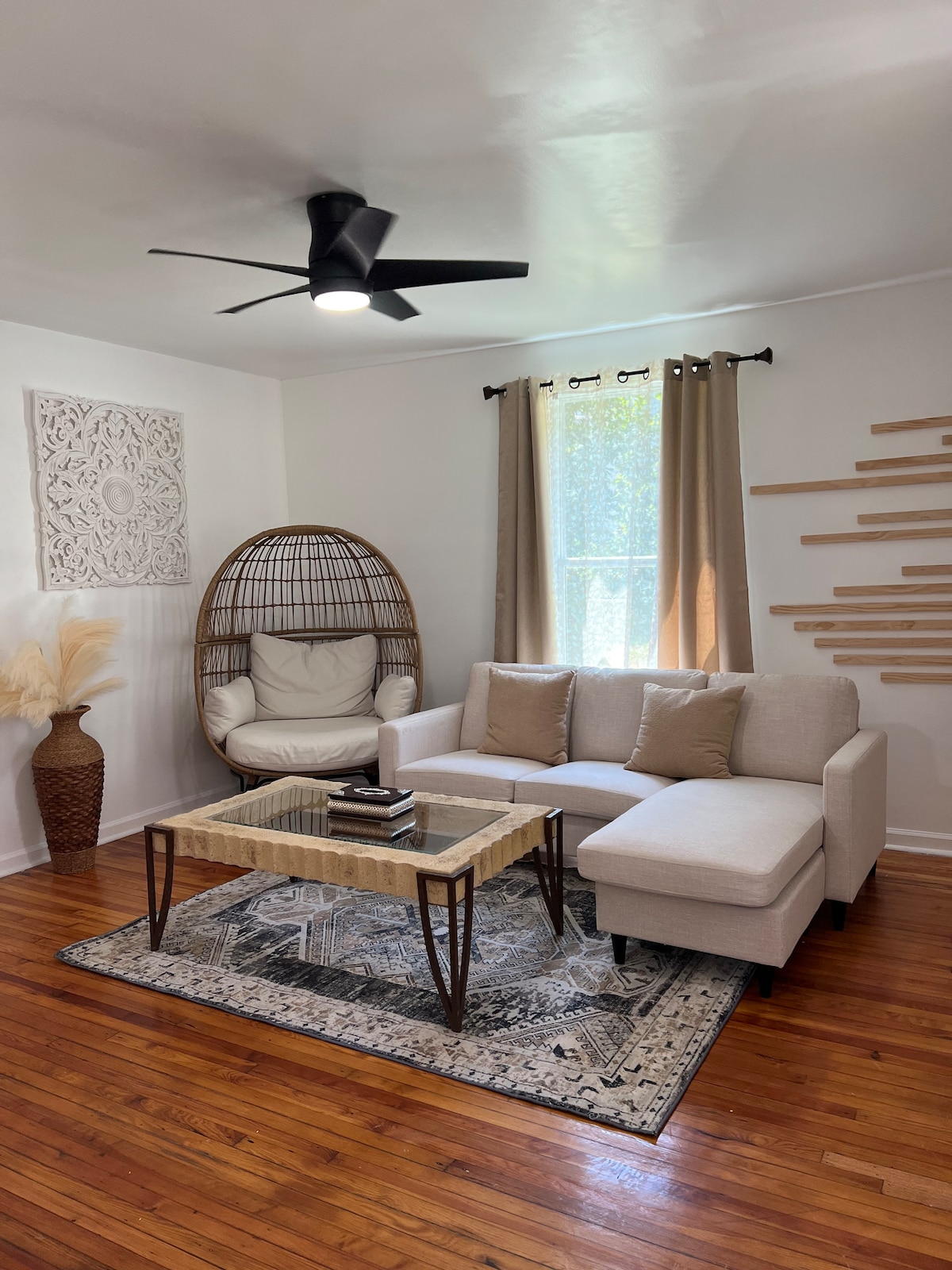 This modern farmhouse/mid century designed place has finished renovation in 2022 and has everything new including furniture and appliances and just about everything you will see. You will love the beautiful hardwood flooring and perfectly painted white walls, owner created and finished fireplace and kitchen accent brick wall design as well as pebble bathroom flooring done exclusively by yours, and only, the owner with the pebbles brought all the way from California! The heart was put into this lovely residence and it is very loved and cared for so we kindly ask you to take very good care of it while you enjoy your stay to keep it’s uniqueness and freshness thriving!