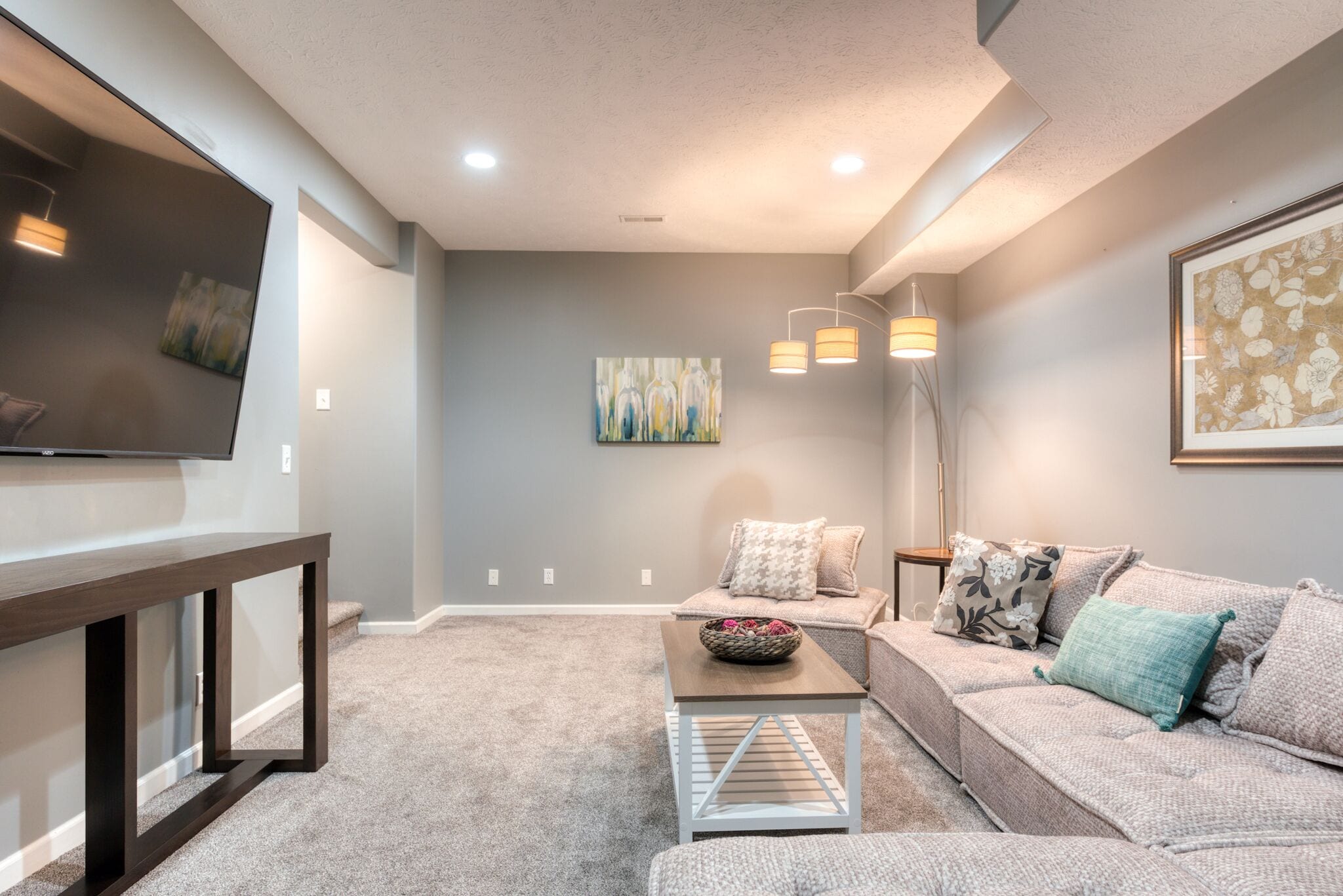 A cozy living room on the main floor and an additional living area on the lower level that includes a queen pull-out sofa bed for additional sleeping space
