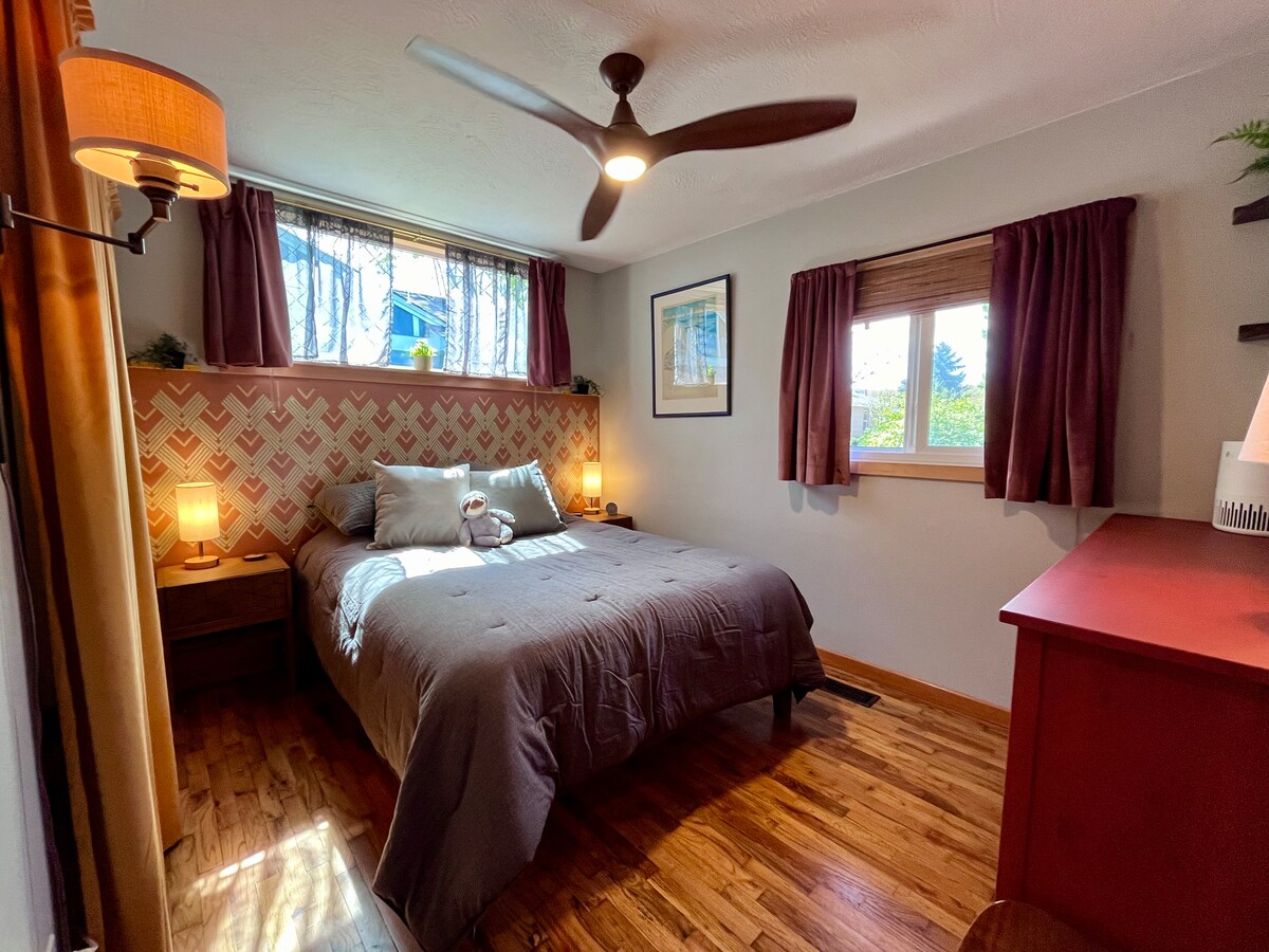 The 1st upstairs bedroom features a comfortable Queen bed with comfy pillows and cotton linens and blankets. A large dresser is available for guests’ personal items. A large unobstructed window lets in plenty of light. This room also has a workstation, and the room can be used as a workspace to set up your laptop and use as a workspace. There is also a very large closet with drawers, shelves and hanging space for guests’ personal items.
