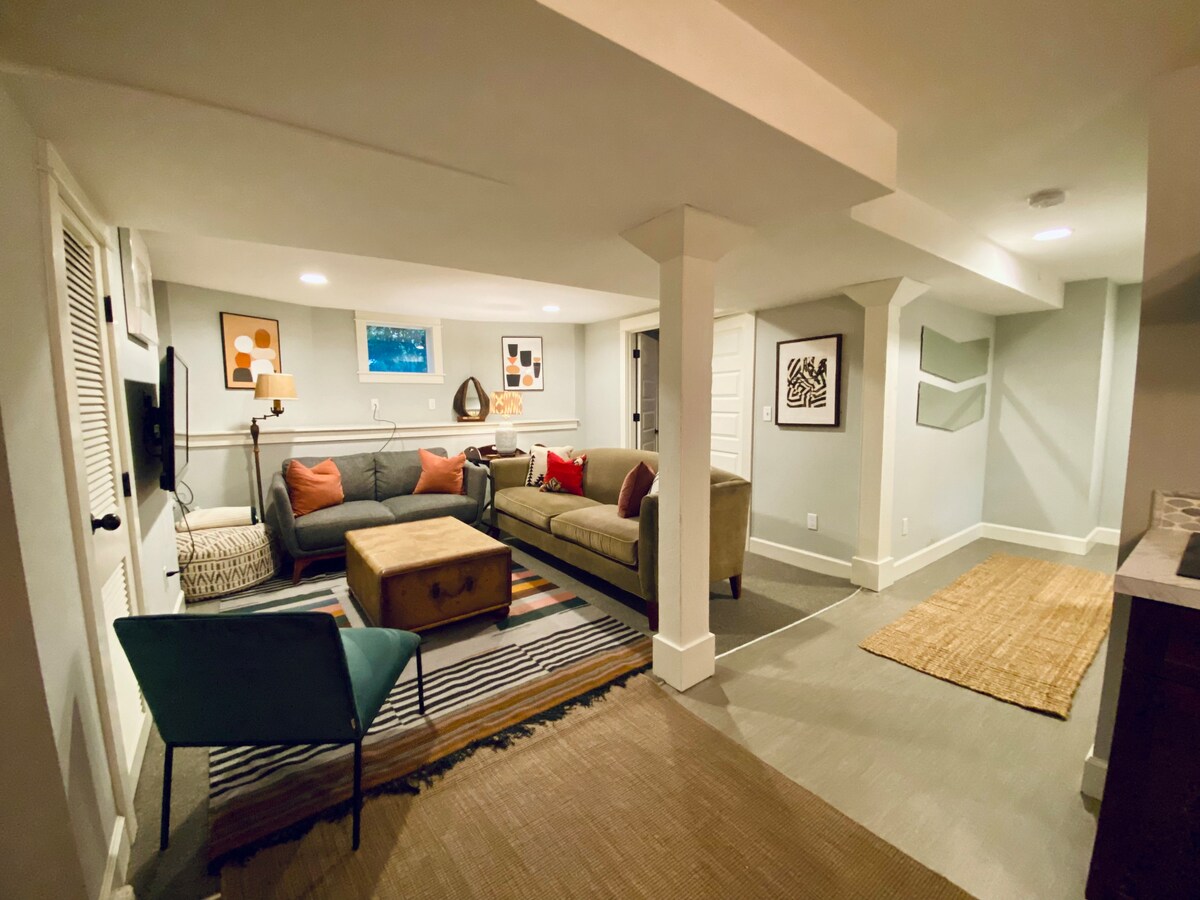 Living room area with a large sleeper sofa that pulls out into a full size bed with a 4” thick memory foam and gel mattres topper. Space for provided full size, high quality air mattress included with rental.