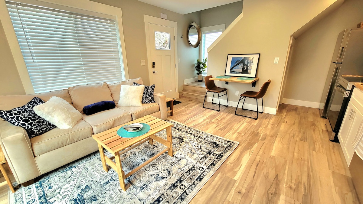 This cozy cottage features a loft bedroom with a memory foam queen sized bed and tempur-pedic pillows. Complete with a full kitchen including concrete countertops, butcher block island, stainless steel appliances, microwave and Nespresso coffee maker. The bathroom, located on the main floor includes a stand up walk-in shower, reclaimed wood vanity and awesome wallpaper. The living area includes a sofa with pull out queen sized sleeper bed, a record player with bluetooth capabilities to play your favorite tunes, board games and books.