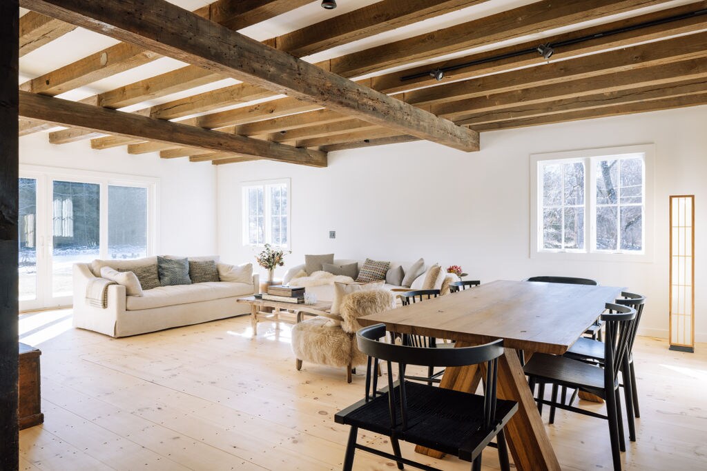 Kick back & relax in this renovated 3 bed, 2.5 bath Hudson Valley farm house. Nestled on 5 private acres, at the top of a hill with stunning views of the surrounding countryside, this extremely private setting is surrounded by large parcels, with not a home in sight. The interior features warm wood beamed ceilings & wide plank floors, creating a cozy & inviting atmosphere. Located just 12 minutes from Rhinebeck Village, this home offers the perfect blend of modern design & rural tranquility.