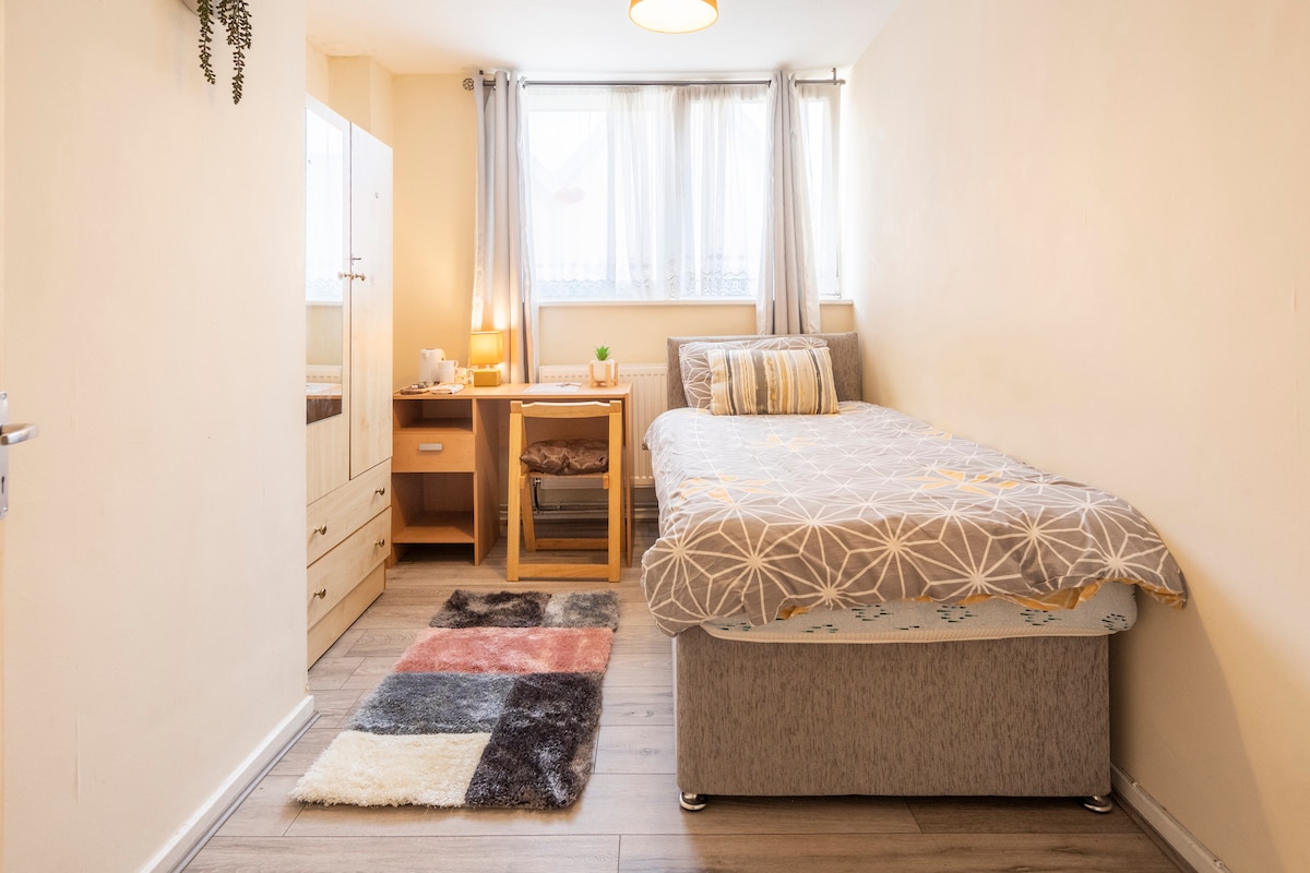 Lovely double room with a quality comfortable single bed and other high quality furnishings including a big desk. My home has two washrooms with showers and toilets, sitting room, large kitchen with large fridge & freezer, utensils and utilities to accommodate you comfortably. All bills, internet and some amenities such as toilet paper etc, are provided, but are not to be misused. We are located in a peaceful area of Newham, with easy access to transport, shops, supermarkets, parks and gyms.