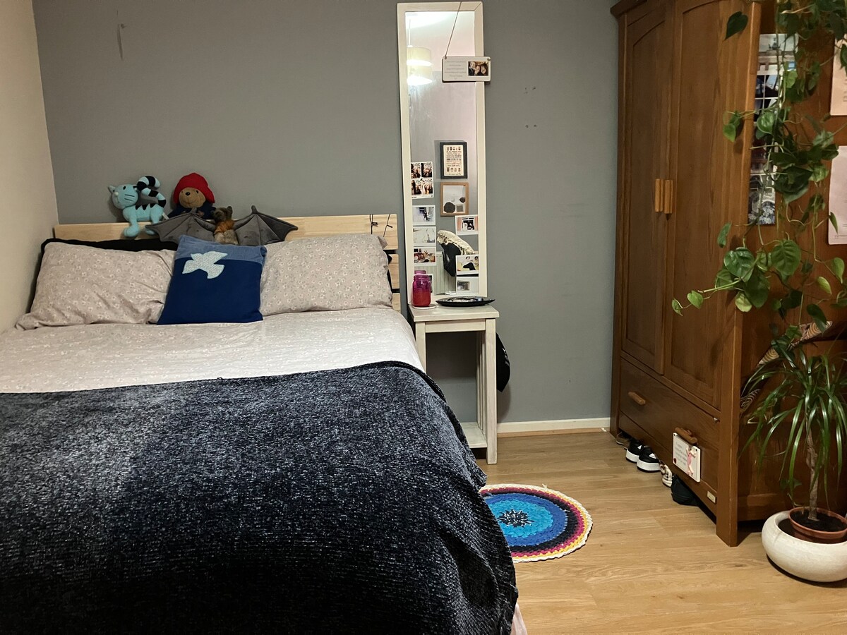 Bright ground floor bedroom with high quality furnishings and a big desk. Shared bathroom, shower room, living room and kitchen.