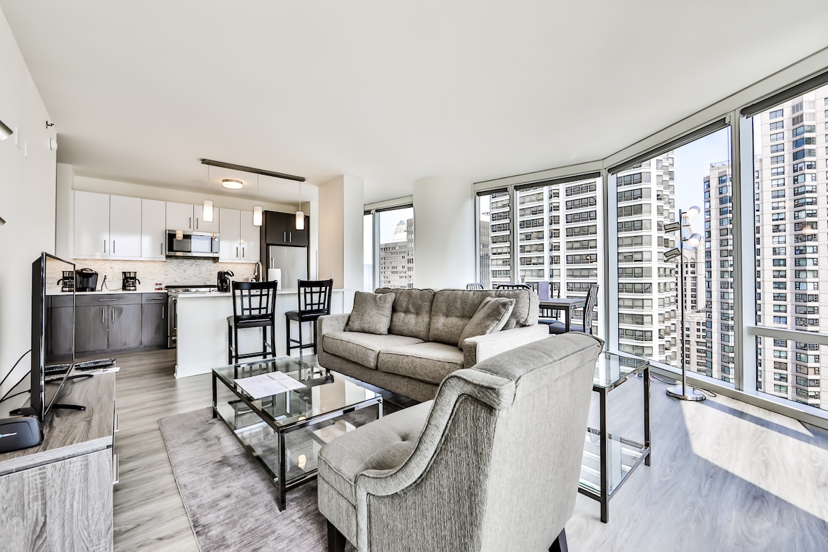 Stunning 1,200 square foot apartment with oversize windows, an open layout, and city/lake views in multiple directions. This bright and modern two bedroom, one bathroom corner unit is perfect for travelers looking for a stylish escape in the sky in downtown Chicago just off the Magnificent Mile and the lakefront. The building has great amenities including an amazing rooftop terrace with 360 degree views of the skyline and the lake. This is the best location in the city!