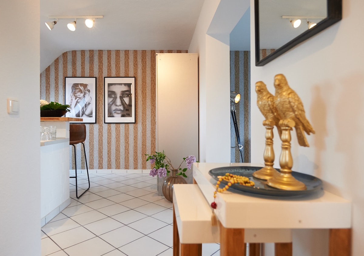 Lovingly renovated and stylishly furnished attic maisonette apartment! The apartment captivates with the open kitchen with a generous counter and a lot of space for cooking (stove, extractor hood, dishwasher, small grill and Nespresso machine). On the right, a spacious living area opens. Dining area. There you go up to the small, cozy duplex area (attention low ceiling!) for sleeping. Arrive, unpack your bags, feel good!