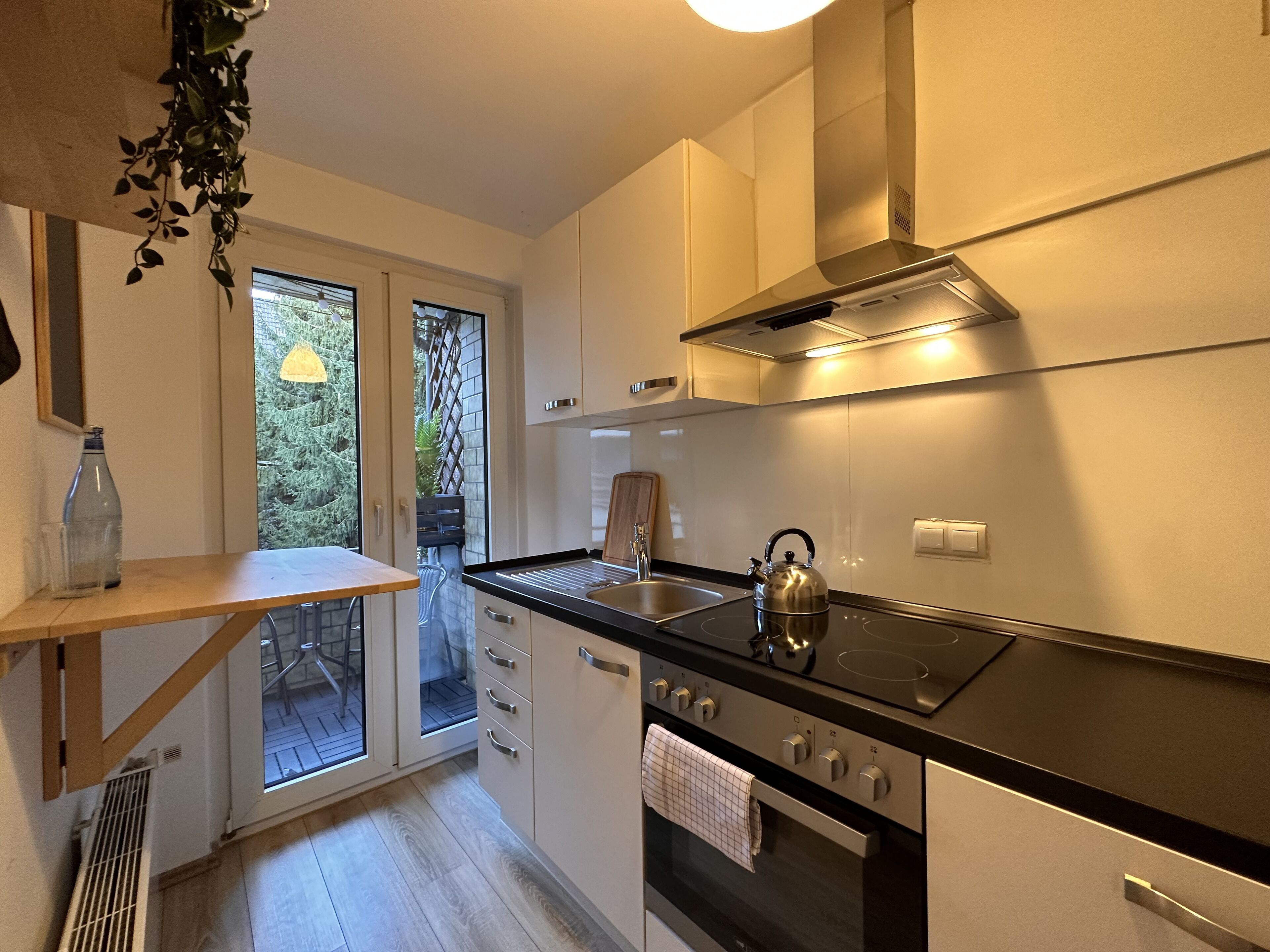 The 40 sqm one-room apartment with kitchen, hallway, and bathroom is located at the rear of the garden on a quiet side street. There is absolutely no traffic noise, and you can enjoy the peace and quiet and the beautiful view of a park-like garden from the terrace. There is a double bed (a fold-away bed with a comfort topper and a new mattress measuring 1.60 m wide) and a sofa bed with a high-quality innerspring mattress (1 m wide), suitable for extended use.