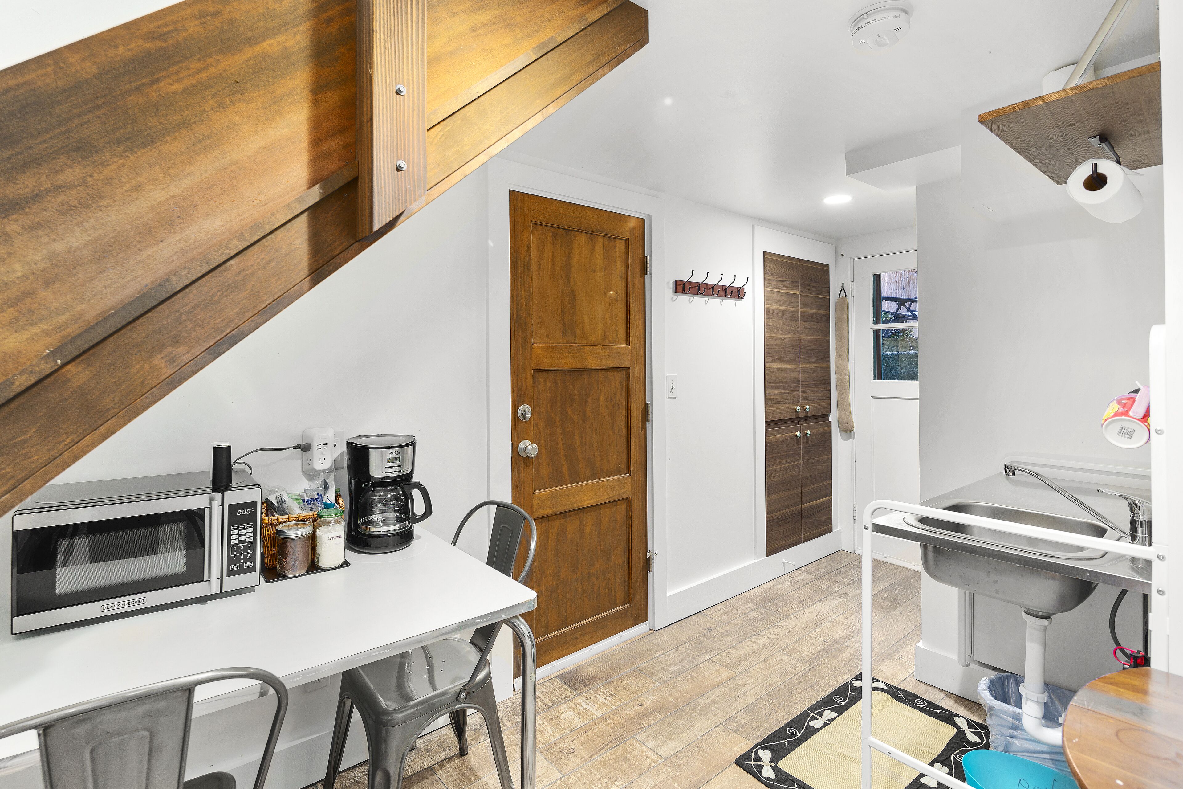 The kitchenette features a full sink, dishwasher, mini fridge, toaster oven, microwave, electric tea kettle, rice cooker, induction hot-plate and waffle maker. There is also a roll-around food-preparation shelf/cart. We provide all the dishes, pans and utensils needed to prepare and serve simple but fresh meals or snacks. This includes a French press coffee maker, pitcher water filter, and baking pans. The back door opens to a fully-fenced yard with stone patio, and an outdoor gas BBQ grill for your use during your stay.