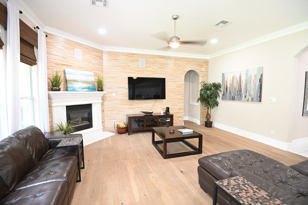They say an open concept is best for entertaining. Well, just ready to entertain! The living room features a spacious lounge area with multiple couches and chairs centering around the stunning double-sided fireplace. Adjacent to the living area, the dining space comfortably seats ten at the stunning 12ft table, making it the perfect spot for family dinners or group meals. Just steps away, the game room amplifies the experience! Surrounded by large windows, the space gets flooded with natural light and looks into the gorgeous backyard. Enjoy the oversized leather sectional centering around a 75-inch flat-screen TV, ideal for movie nights or watching the game. A six-person card table, shuffleboard, and Golden Tee arcade ensures endless fun for guests of all ages. *Bonus feature is the wet bar, wine fridge & ice machine.