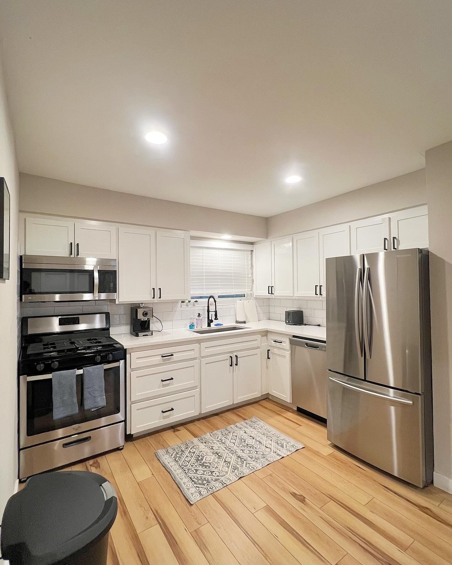 Designed with large groups in mind, we sparred no expense on the high-end stainless steel appliances and modern fixtures. It features a professional-grade gas stovetop, a spacious double oven, and a large refrigerator, ensuring plenty of room for your culinary adventures. The waterfall marble island offers six additional bar seats and ample counter space for prepping meals. A high-end, 16-cup, Ninja coffee maker, blenders, quality pots and pans, and enough dishware for your whole group, we set you up for success for that special meal!