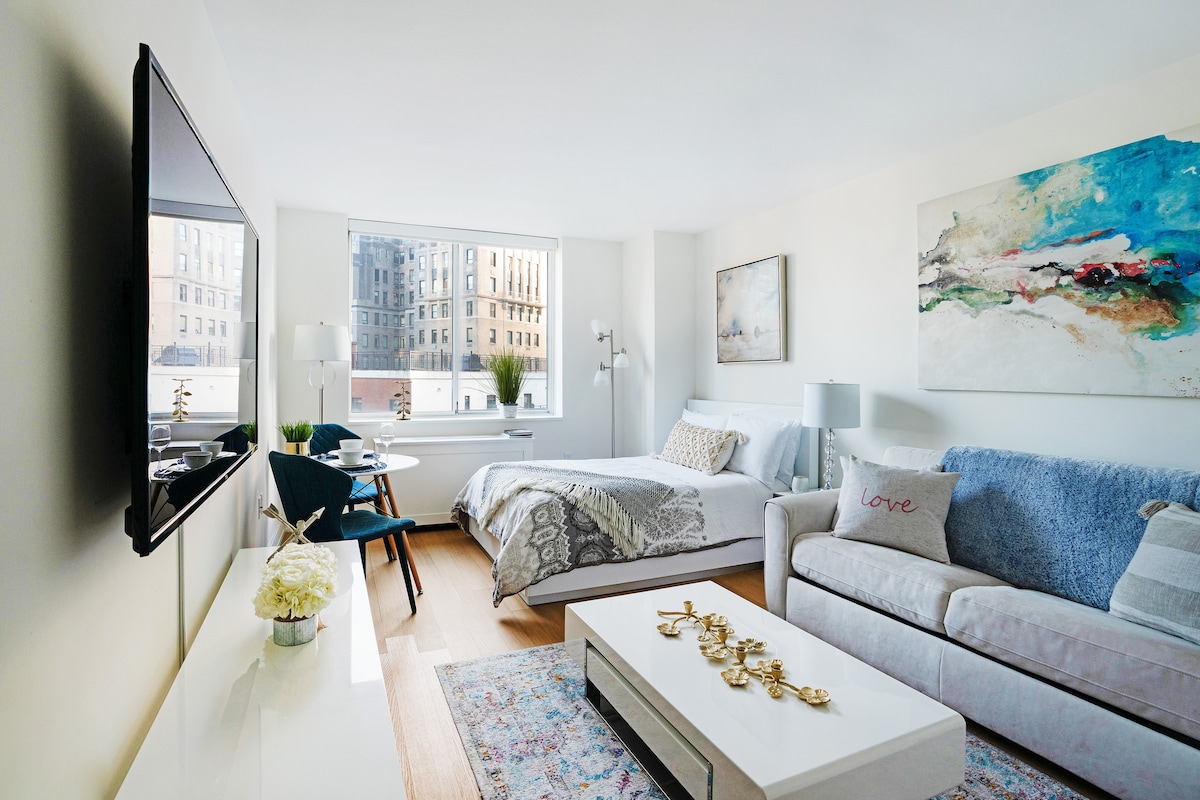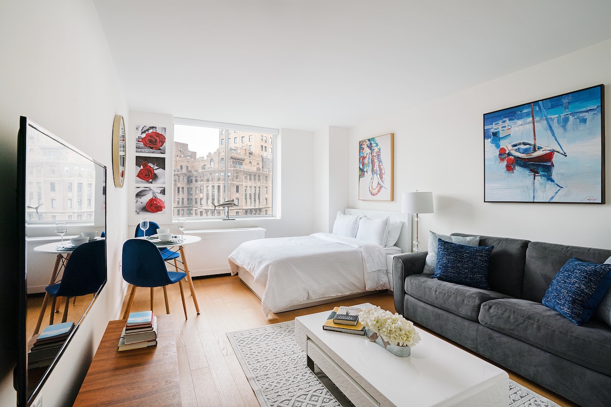 A furnished studio apartment in Midtown East,a compact yet efficient, offering an ideal living space for individuals seeking a central location in Manhattan.