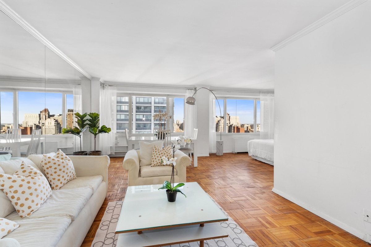 Enjoy the magnificent sunrise and sunset over the city with panoramic views from this bright quiet studio in the middle of it all! Full service building with all amenities for a wonderful stay. This is simply the ideal location from which to explore the best of what New York City has to offer! * Please note: this is one open space, arranged like a loft, with 2-3 sleeping areas, main bedroom area with King Bed, second bed area with Queen Size Bed, large sofa area.