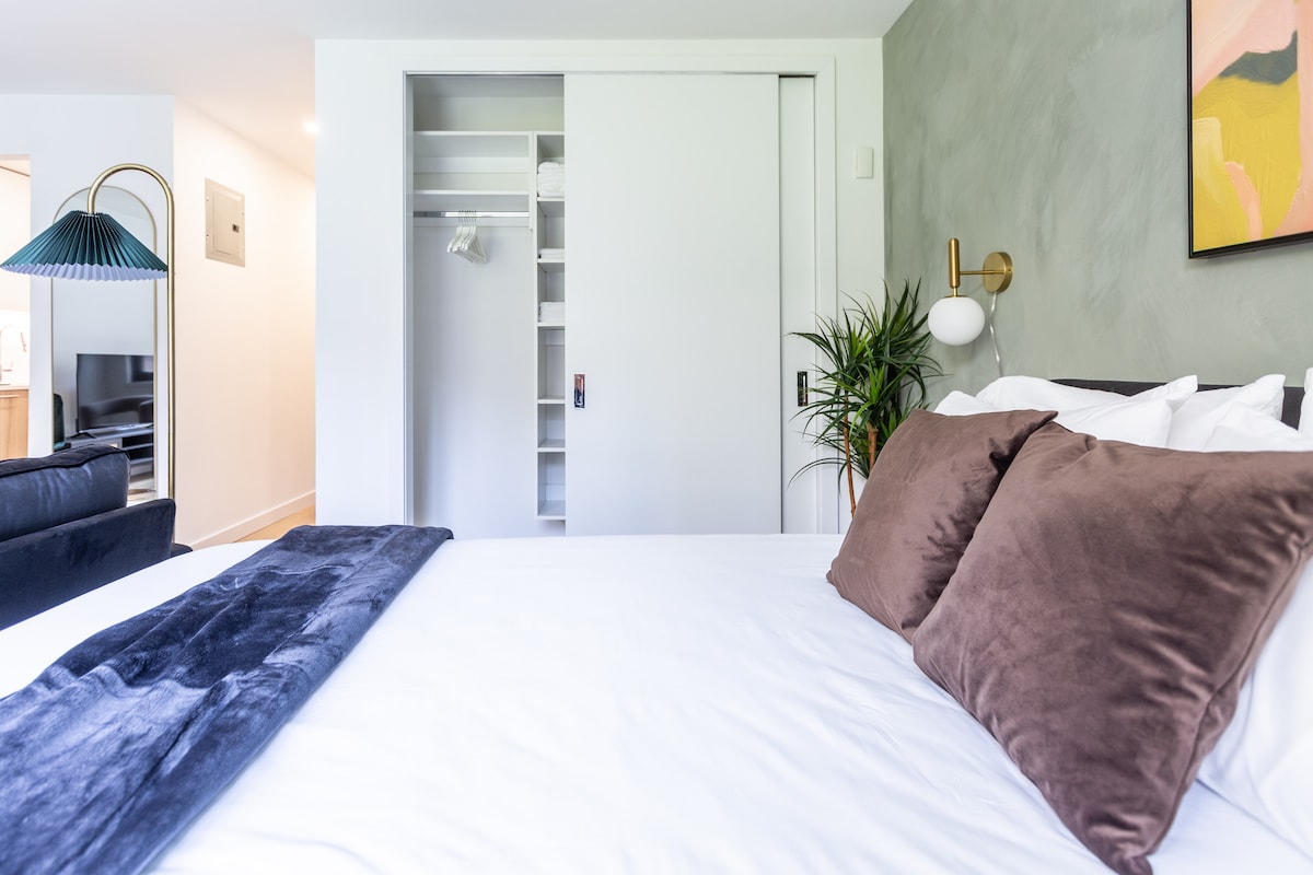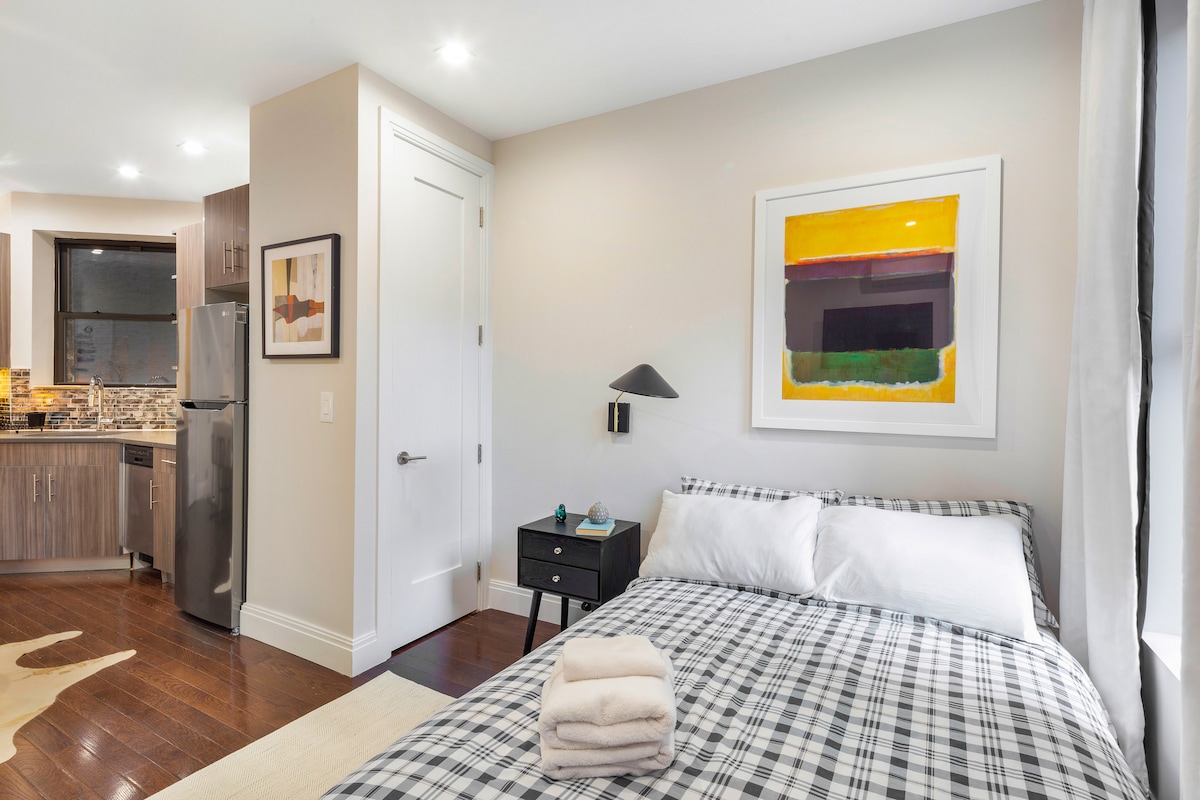 Fully renovated with south exposure and lots of windows. The unit has a queen-size bed with a 5-star comfy mattress, custom built-in closets. White oak flooring, custom built-in closets. Custom kitchens boast stainless-steel Blomberg appliances, calacatta quartz countertops, and full-height backsplash. Bathroom features include full-height imported Italian tiles and glass-enclosed showers.
