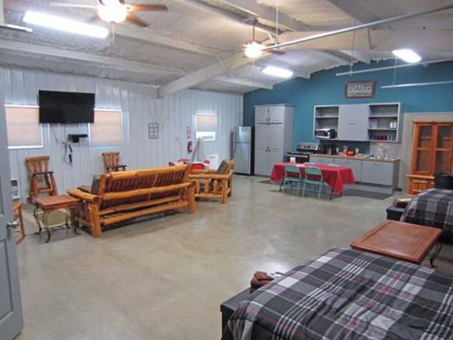Large bunkhouse cabin with three queen-sized beds. If you are looking for plenty of room to spread out for a weekend or longer with family, or hunting buddies, this will be the perfect place for you. Sit outside and enjoy the night air, or take a walk around our walking path. If you are hungry, wander down to our restaurant and bar located right on the property!