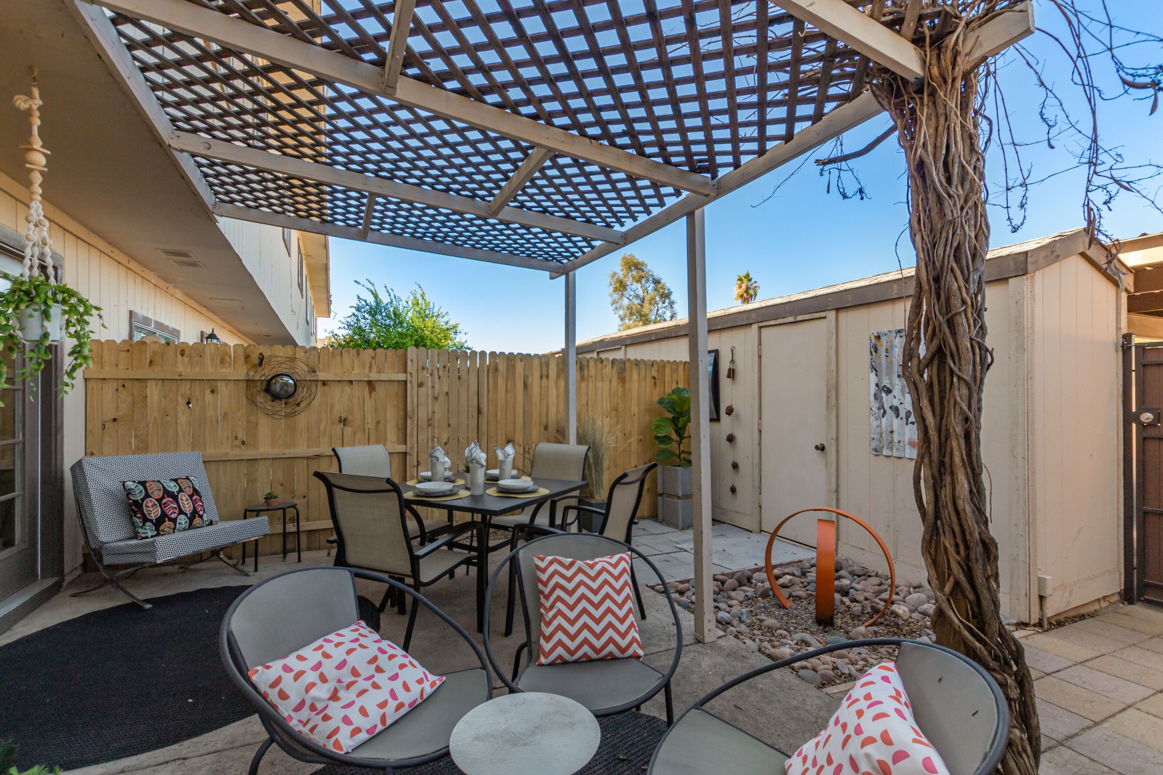 From the kitchen, you can access the backyard. We have created a tranquil environment with outdoor seating to enjoy your morning coffee or a BBQ meal with friends and family with the beautiful AZ sunset as your backdrop.